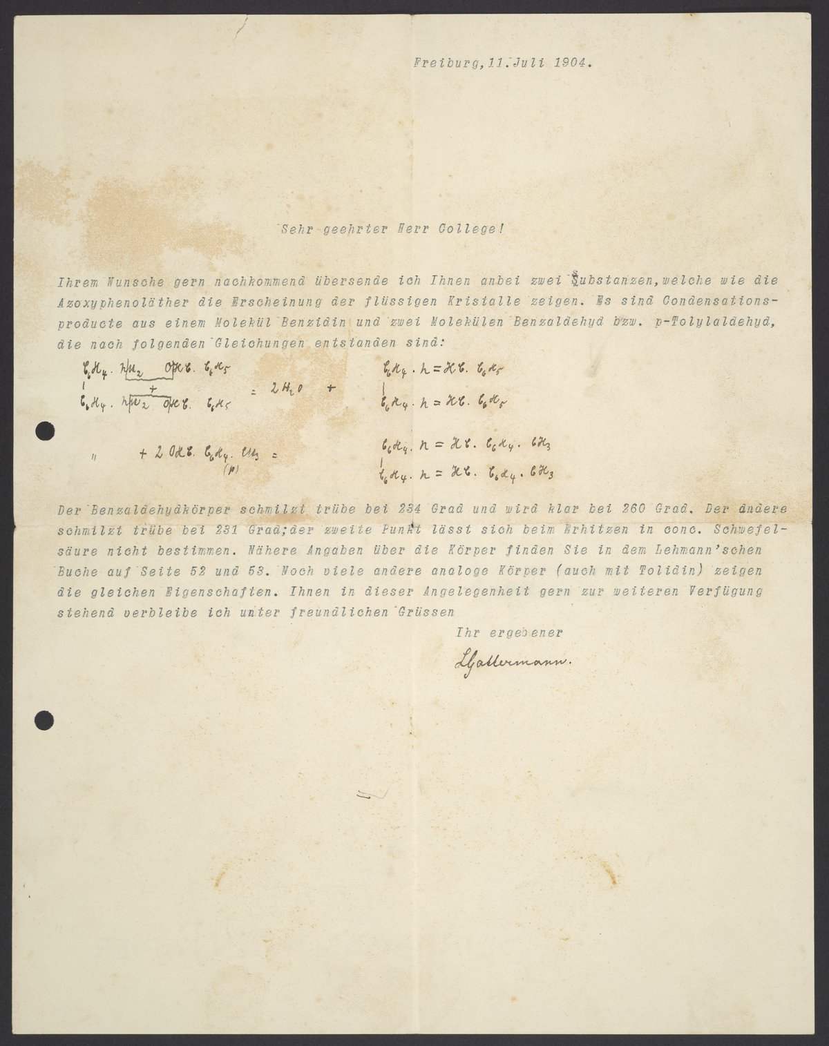 Ludwig Gattermann (1860-1920) writes to Georg Bredig (1868-1944) about substances that show the appearance of liquid crystals, along with chemical equations and a suggestion to look at a book by Otto Lehmann (1855–1922).