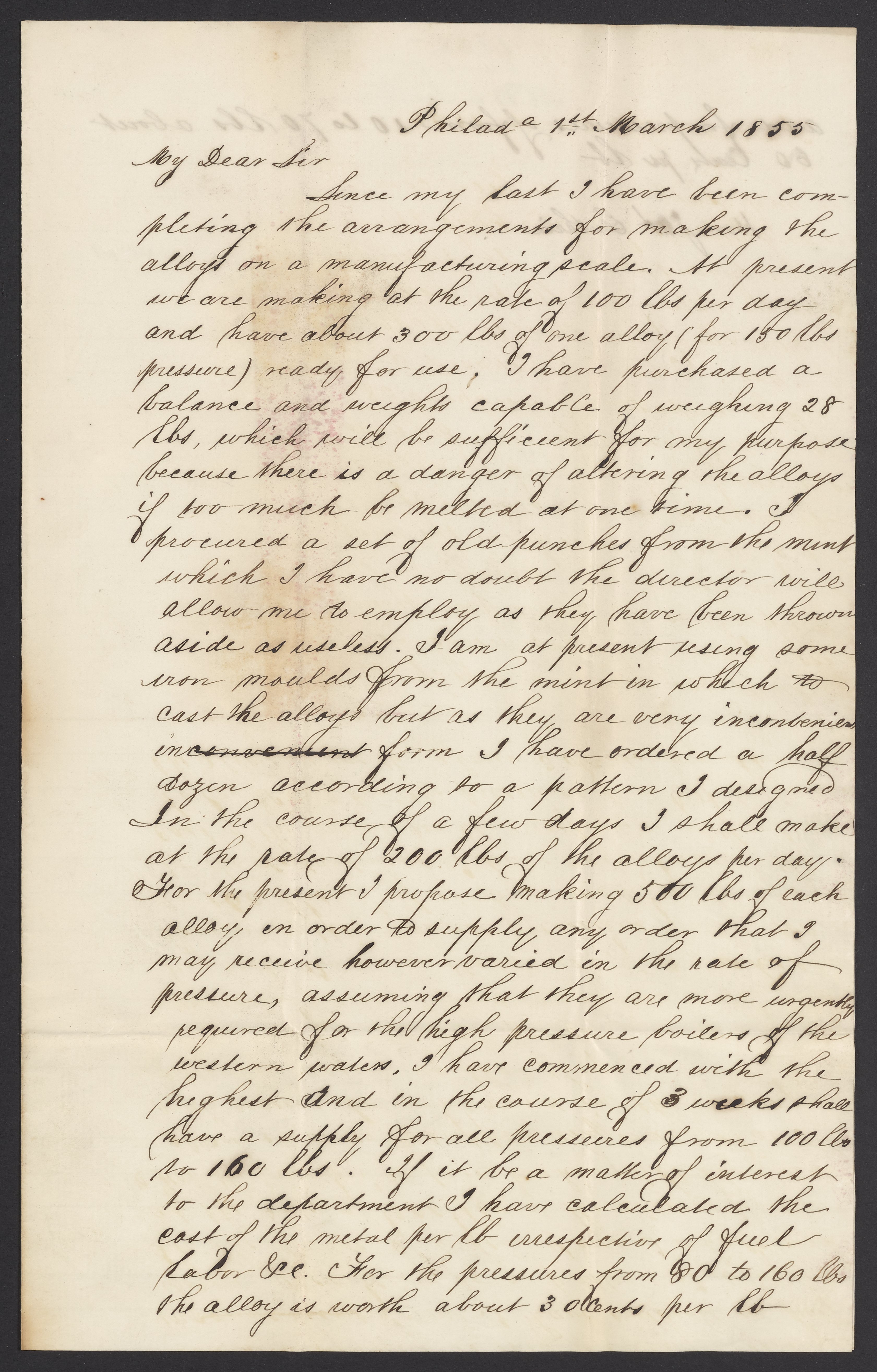 Small JPG1200 x 1878px — 414 KBLarge JPG2880 x 4506px — 1.7 MBFull-sized JPG3361 x 5259px — 2.2 MBOriginal fileTIFF — 3361 x 5259px — 50.6 MBJames Curtis Booth (1810-1888), melter and refiner of the United States Mint, writes to James Guthrie (1794-1869), Secretary of the Treasury, to discuss the making of experimental alloys on a manufacturing scale.