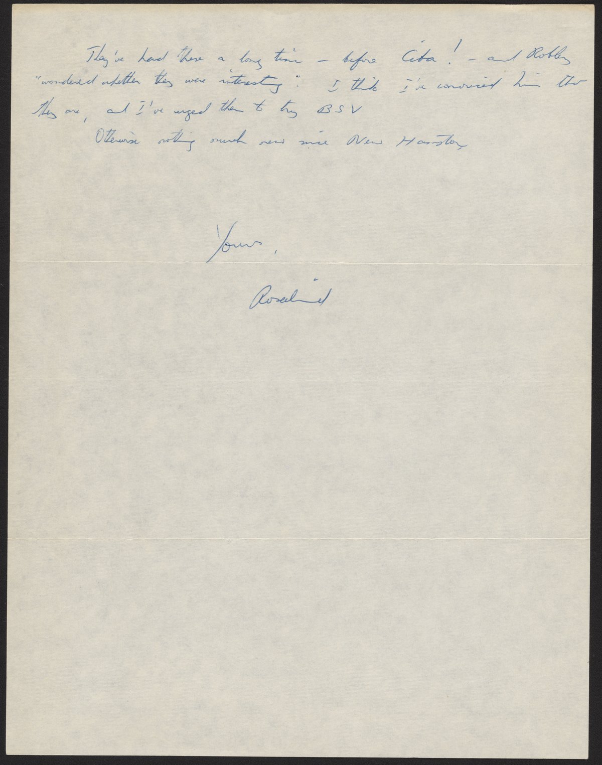 Small JPG1200 x 1548px — 249 KBLarge JPG2880 x 3715px — 1.6 MBFull-sized JPG5240 x 6760px — 5.3 MBOriginal fileTIFF — 5240 x 6760px — 101 MBPersonal and professional letter from Rosalind Franklin (1920-1958) to Donald Caspar (1927-2021). The two collaborated at Birkbeck College, focusing on the structure of the tobacco mosaic virus (TMV).