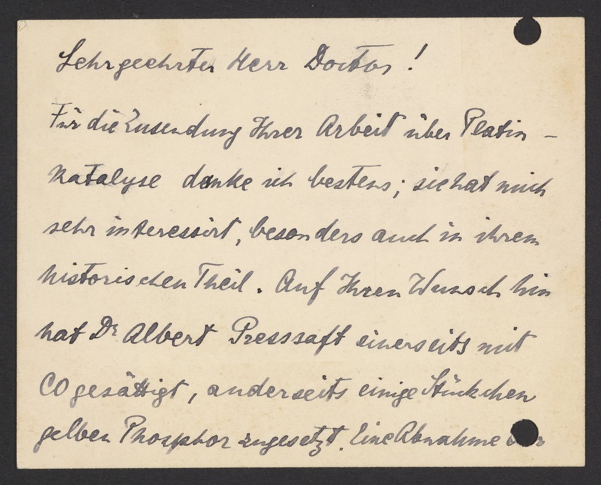 Für die Zusendung Ihrer Arbeit über Platinkatalyse danke ich bestens; sie hat mich sehr interessiert, besonders auch in ihrem historischen Theil. Auf Ihren Wunsch hin hat Dr. Albert Presssaft einerseit mit CO gesättigt, anderseits einige Stückchen gelben Phosphors zugesetzt. Eine Abnahme von