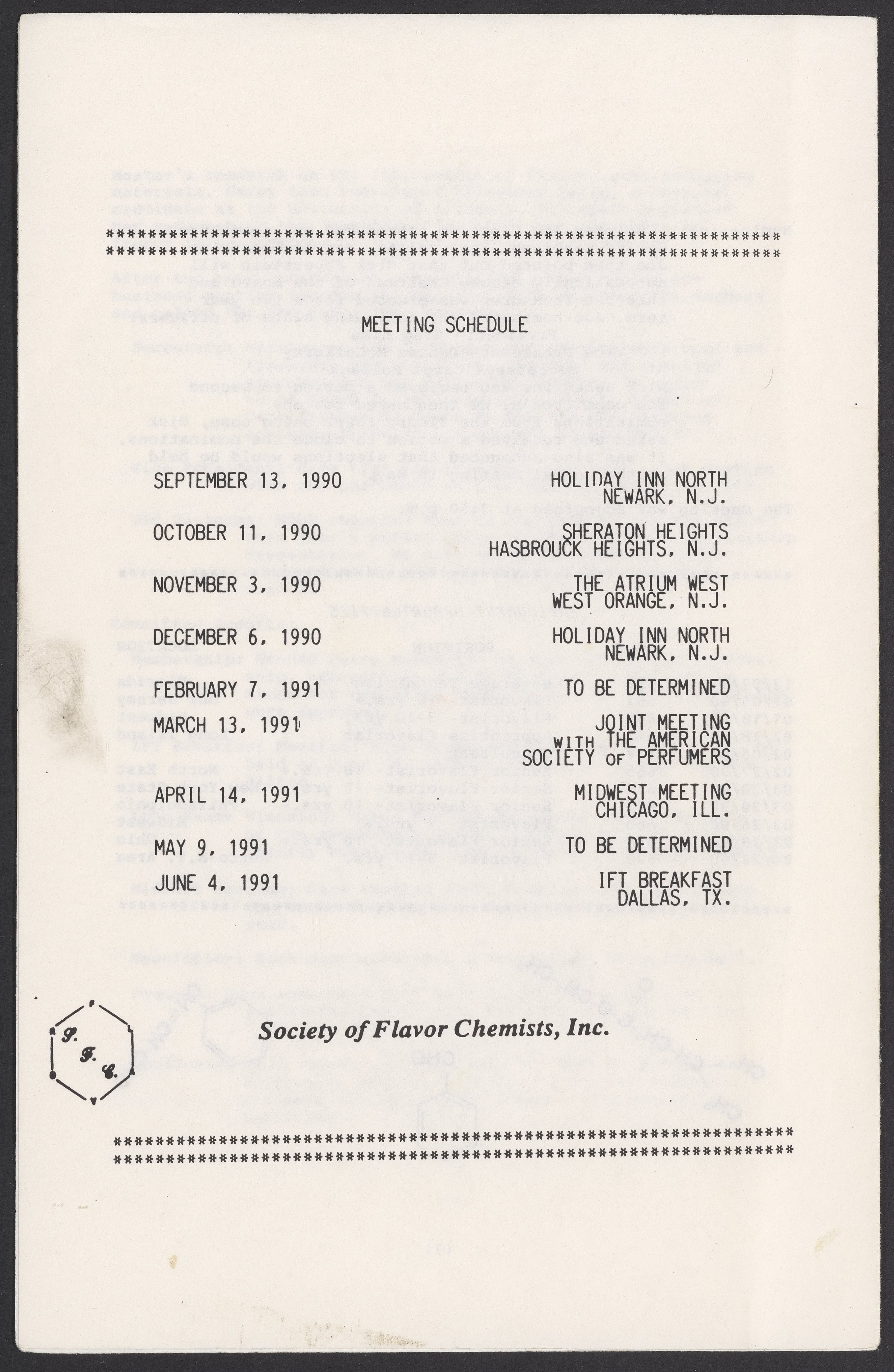 Society of Flavor Chemists. “Society of Flavor Chemists Newsletter, September 1990,” September 1, 1990. Society of Flavor Chemists Newsletters , Box 1, Folder 1. Science History Institute. Philadelphia. https://digital.sciencehistory.org/works/akm4re4.