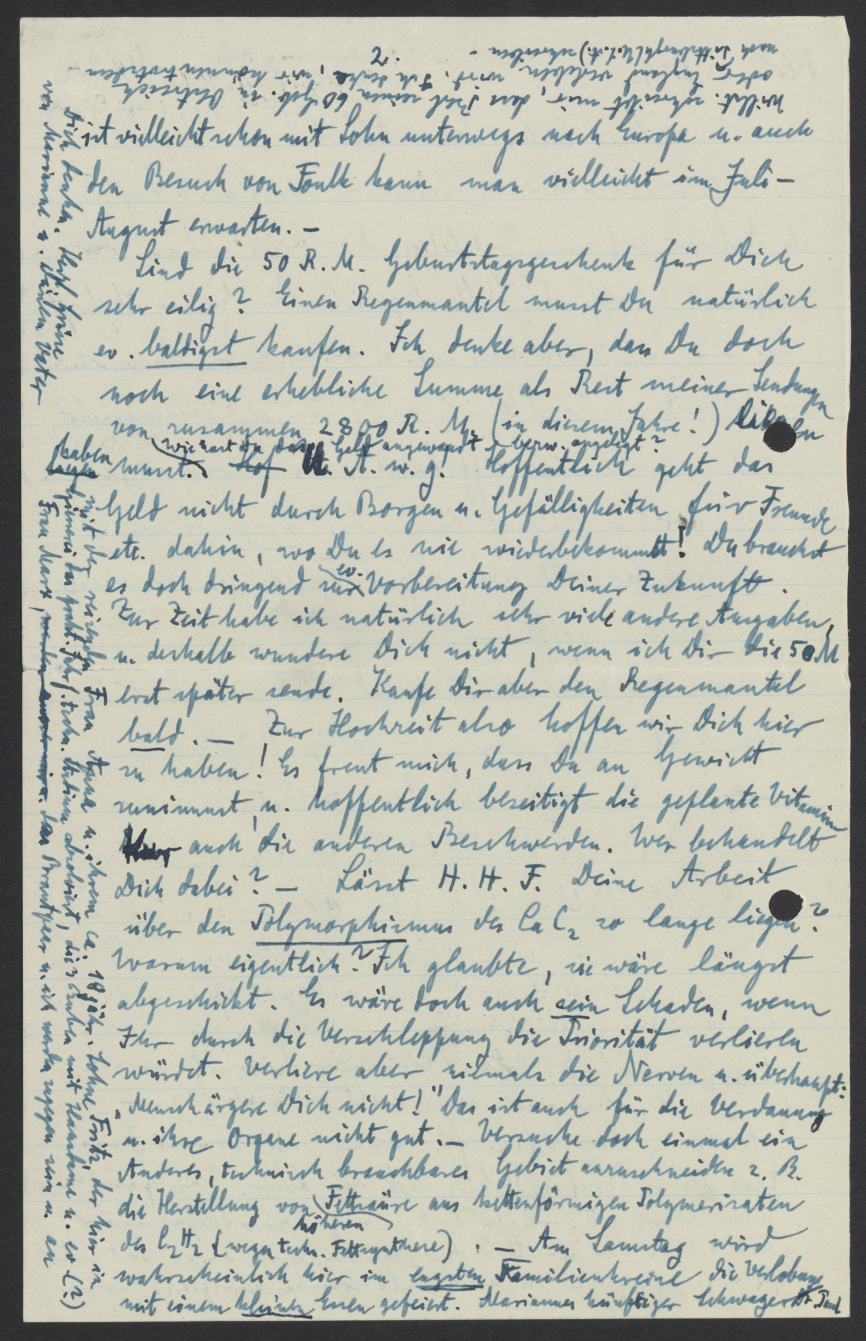 Sind die 50 R.M. Geburtstagsgeschenk für Dich sehr eilig? Einen Regenmantel musst Du natürlich ev. baldigst kaufen. Ich denke aber, dass Du doch noch eine erheblich Summe als Rest meiner Sendungen von zusammen 2800 R.M. (in diesem Jahre! bezw. angelegt?) haben musst! Wie hast du das Geld angewandt? Hoffentlich geht das Geld nicht durch Borgen u. Gefälligkeiten für Freunde etc. dahin, wo Du es nie wiederbekommst! Du brauchst es doch dringend zur ev. Vorbereitung Deiner Zukunft.