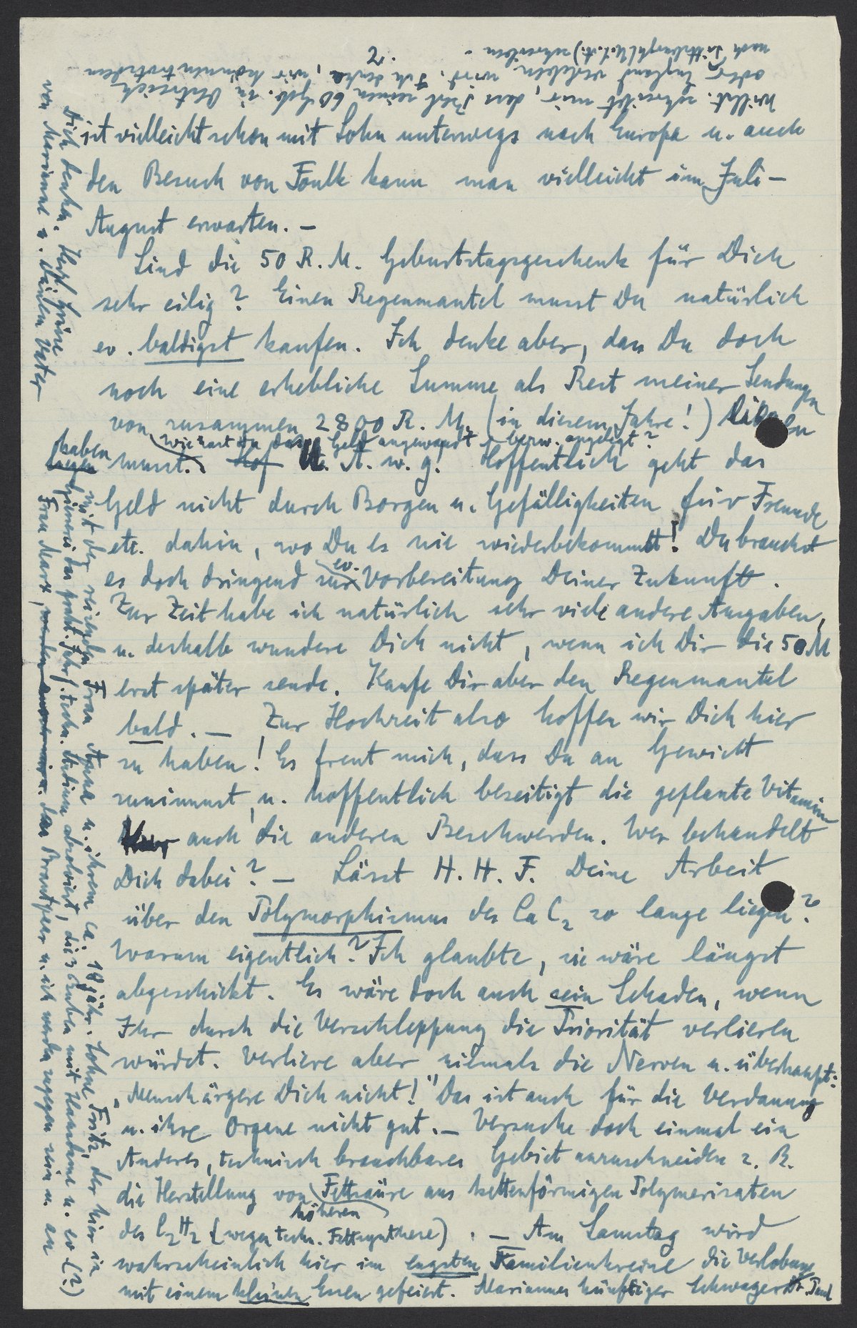 Zur Zeit habe ich natürlich sehr viele andere Ausgaben u. deshalb wundere Dich nicht, wenn ich Dir die 50 M. erst später sende. Kaufe Dir aber den Regenmantel bald. – Zur Hochzeit also hoffen wir Dich hier zu haben! Es freut mich, dass Du an Gewicht zunimmst, u. hoffentlich beseitigt die geplante Vitamin-Kur auch die anderen Beschwerden. Wer behandelt Dich dabei? – Lässt H.H.F. Deine Arbeit über Polymorphismus des CaC2 zu lange liegen? Warum eigentlich? Ich glaubte, sie wäre längst abgeschickt. Es wäre doch auch ein Schaden, wenn Ihr doch durch die Verschleppung die Priorität verlieren würdet. Verliere aber niemals die Nerven u. überhaupt: „Mensch ärgere Dich nicht!“ Das ist auch für die Verdauung u. ihre Organe nicht gut.- Versuche doch einmal ein Anderes, technisch brauchbares Gebiet anzuschneiden z.B. die Herstellung von höheren Fettsäure aus kettenförmige Polymerisaten des C2H2 (wegen techn. Fettsynthese). – Am Samstag wird wahrscheinlich hier im engsten Familienkreise die Verlobung mit einem kleinen Essen gefeiert. Mariannes künftiger Schwager Dr. Paul Homburger