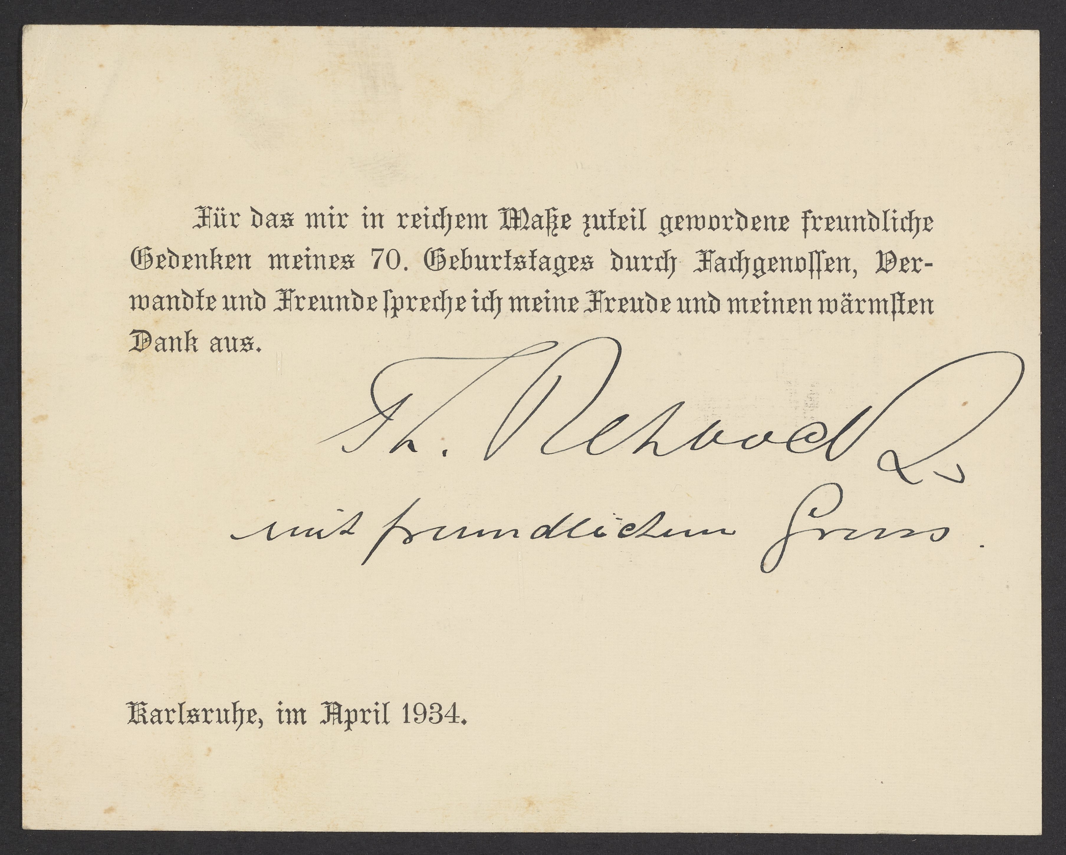 Thank you note signed by Theodor Christoph Heinrich Rehbock's (1864-1950) for 70th birthday wishes. Rehbock was a German hydraulics engineer and professor at the University of Karlsruhe.
