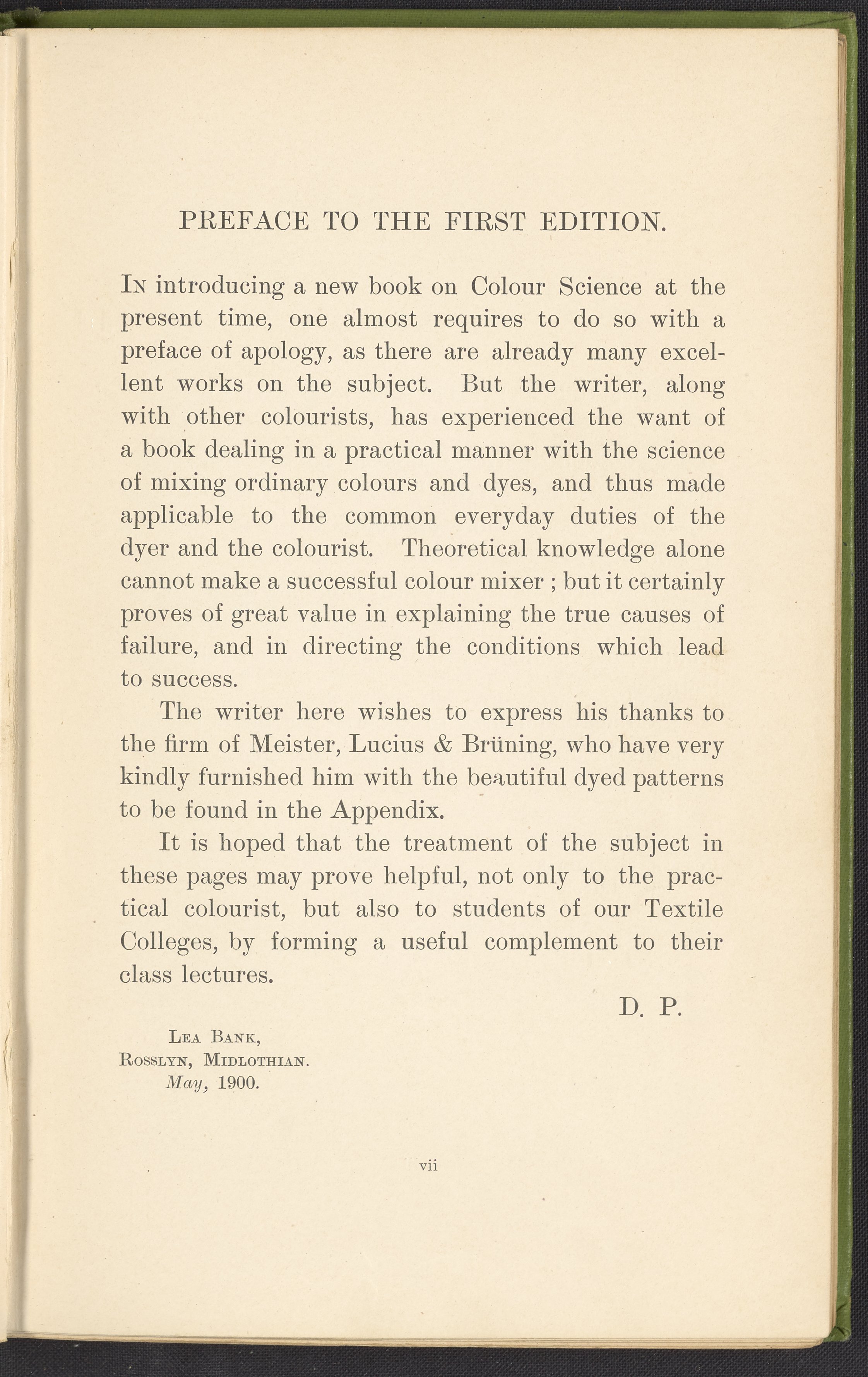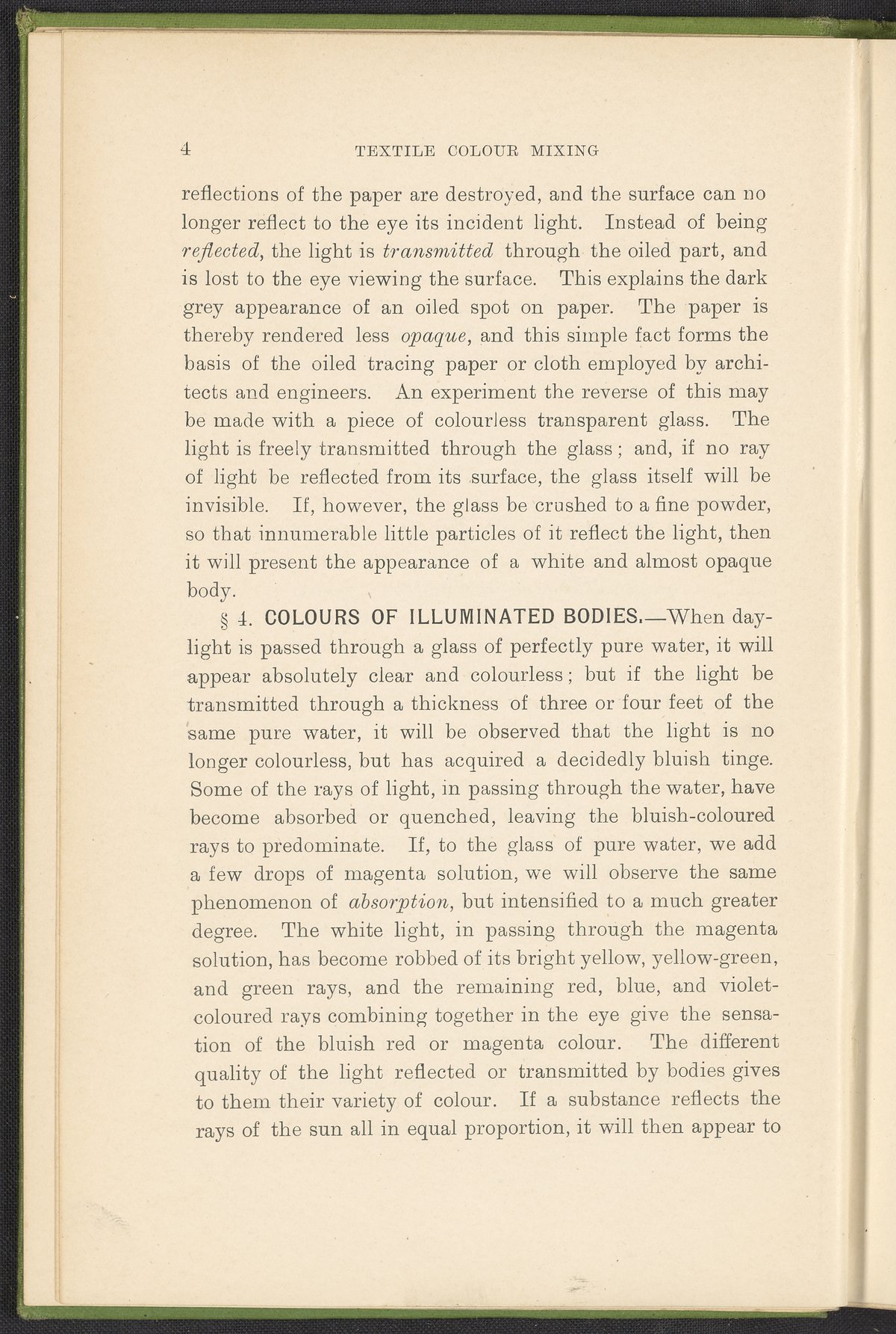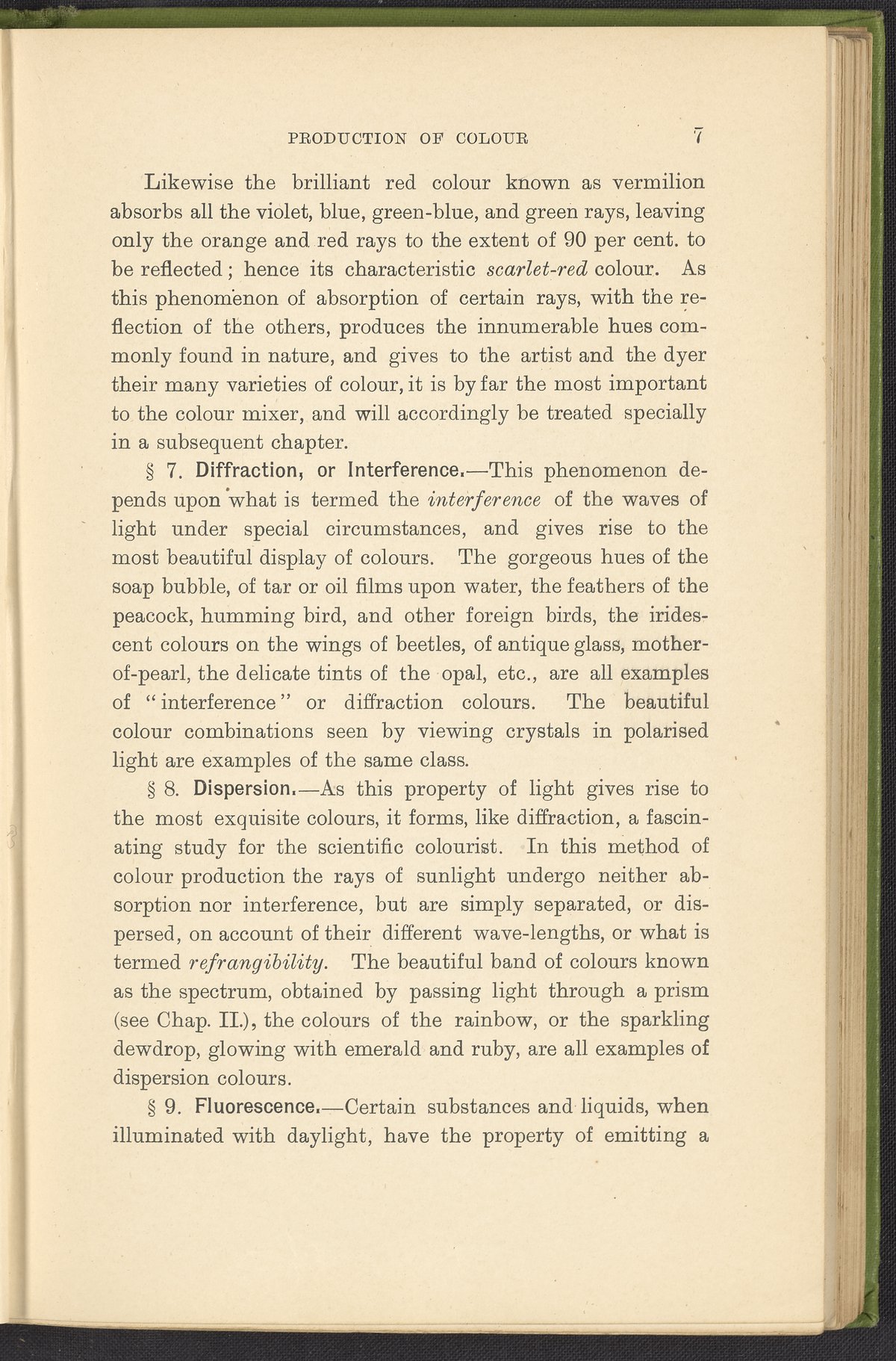 Small JPG1200 x 1784px — 330 KBFull-sized JPG2446 x 3636px — 1.2 MBOriginal fileTIFF — 2446 x 3636px — 25.5 MBA second revised edition of a text on color science. According to the author in his preface, this work deals “in a practical manner with the science of mixing ordinary colours and dyes… thus made applicable to the common everyday duties of the dyer and the colourist.” The work was written to complement the coursework of students enrolled in Textile Colleges as well as to provide technical context for color professionals. Contents include absorption spectroscopy, light waves and analysis, color mixing, primary colors, secondary colors, and tertiary shades. Includes five colored plates, four plates with dye samples, and 40 figures and illustrations. Work is digitized in its entirety.
