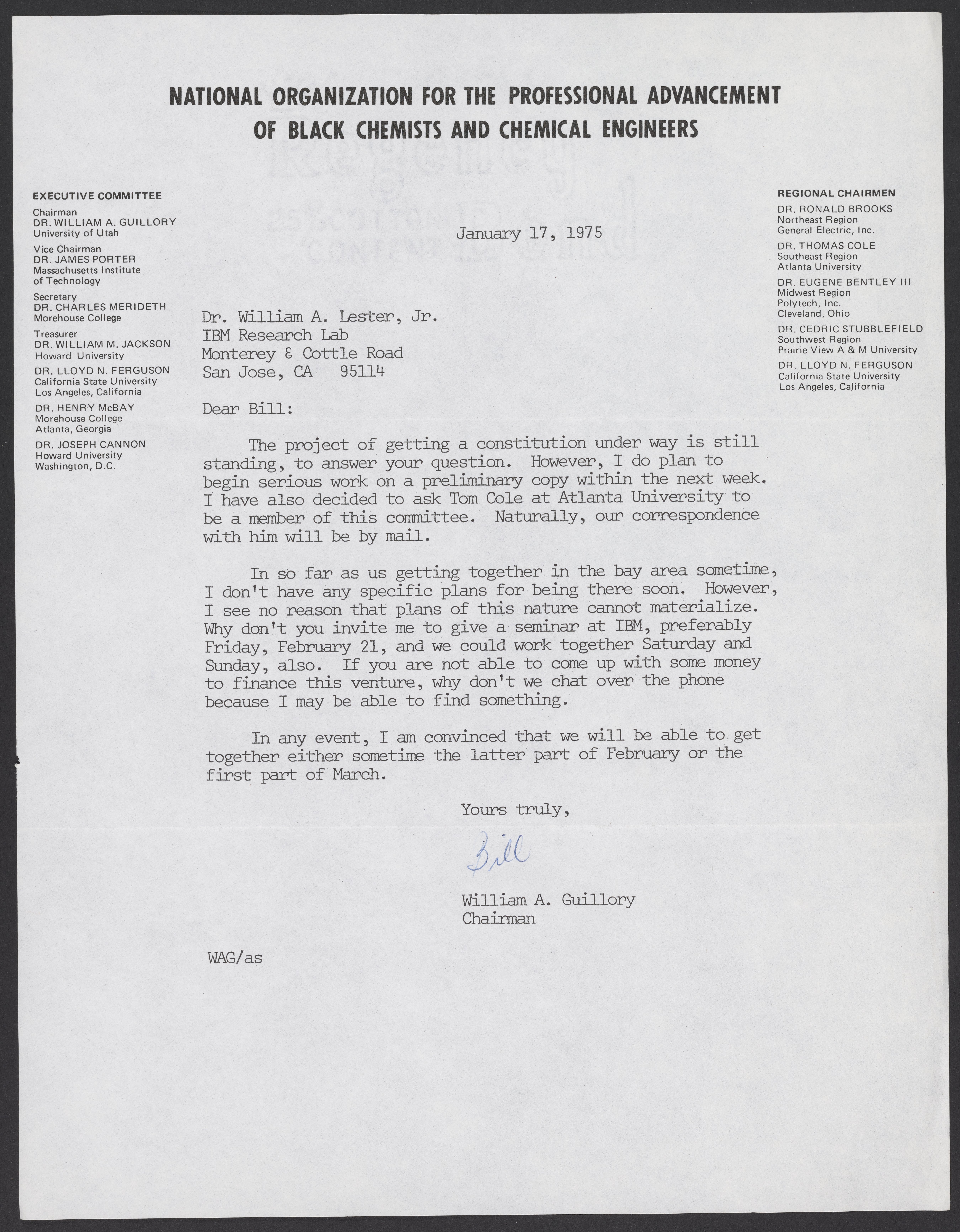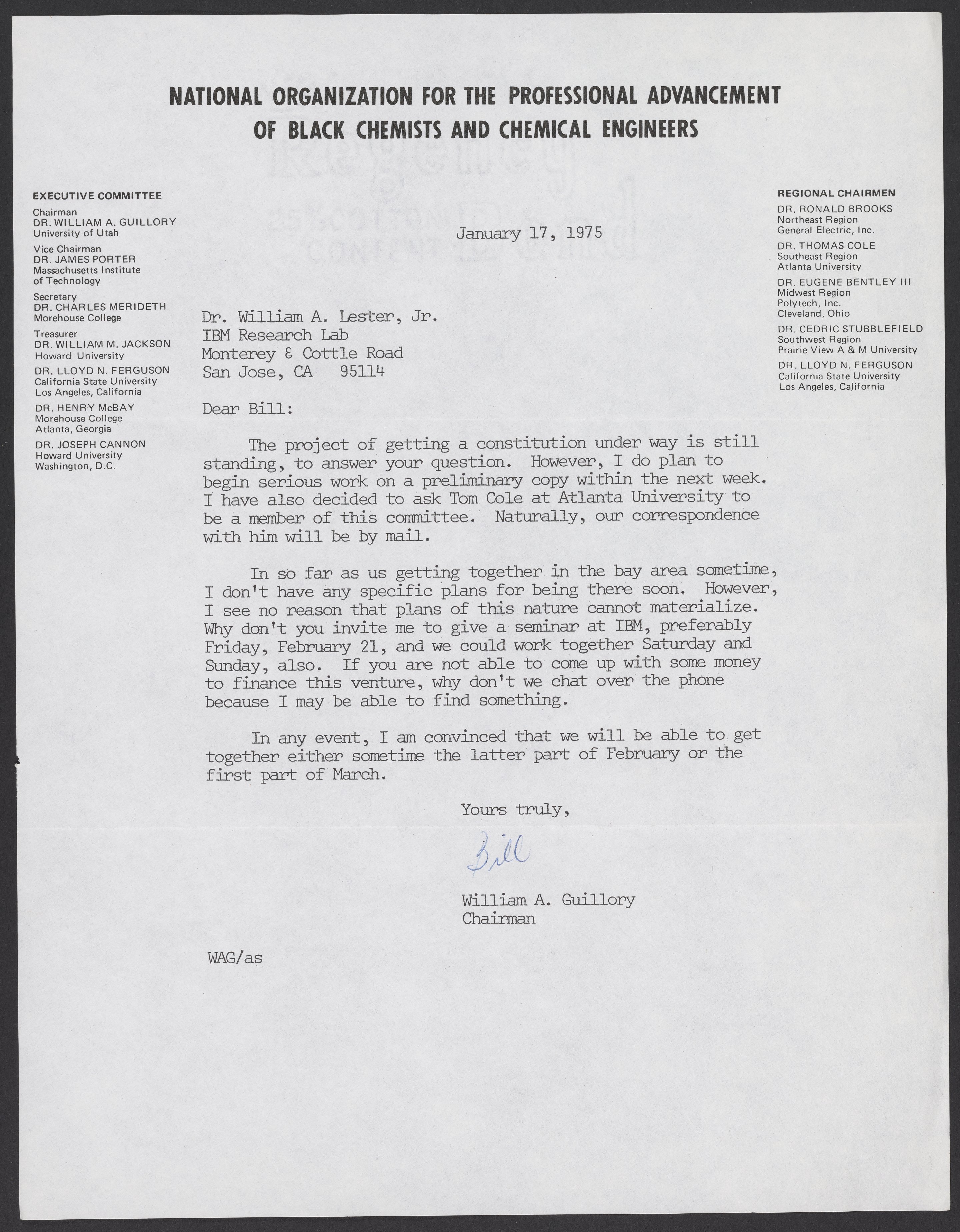 William A. Guillory writes to William A. Lester, Jr. (1937-) about the National Organization for the Professional Advancement of Black Chemists and Chemical Engineers (NOBCChE).