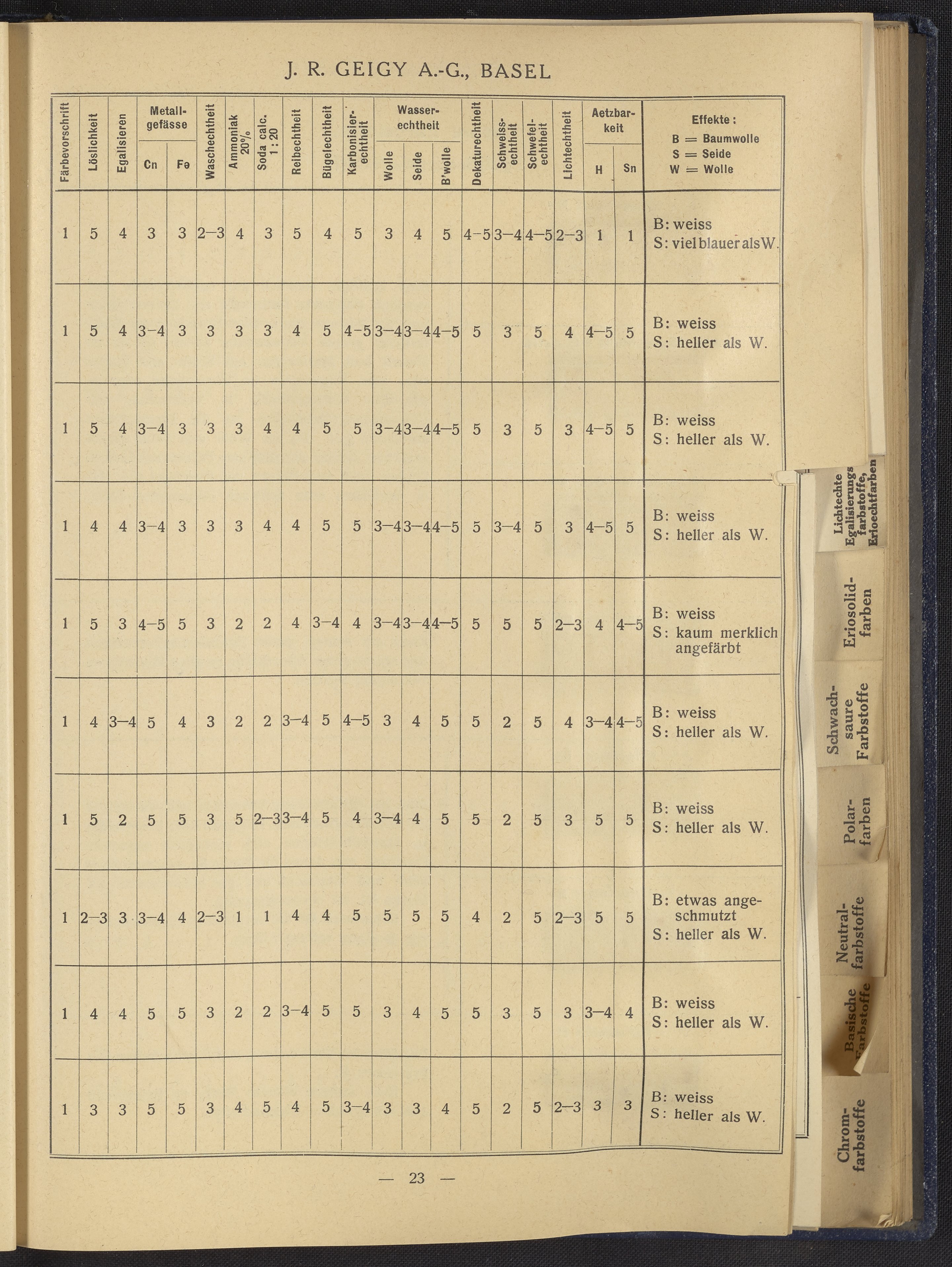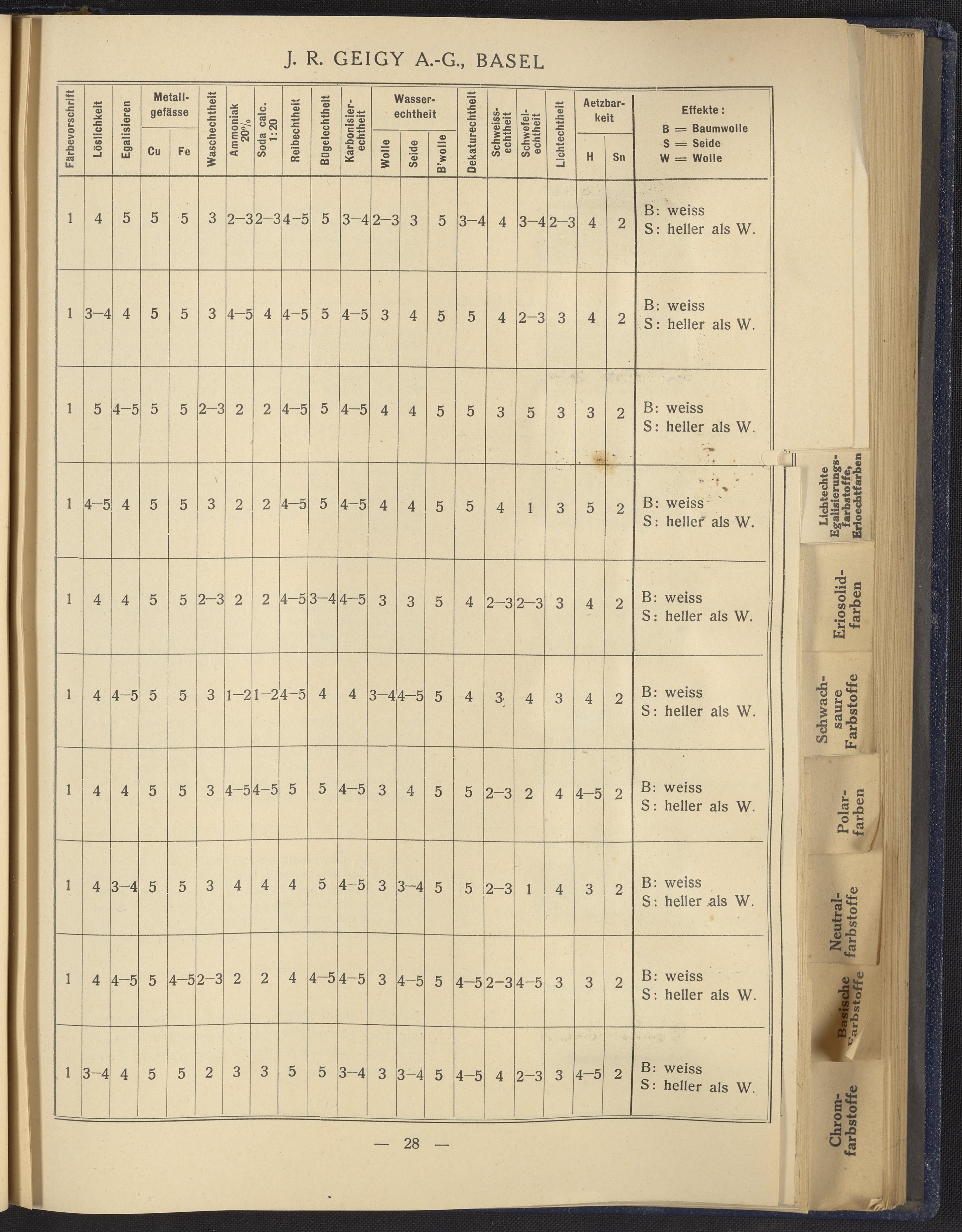 Small JPG1200 x 1515px — 513 KBLarge JPG2880 x 3637px — 2.8 MBFull-sized JPG3185 x 4022px — 3.3 MBOriginal fileTIFF — 3185 x 4022px — 36.7 MBThe third edition of a sample book advertising woolen dye products from J. R. Geigy AG. Contains 289 dyed woolen samples. Information about each sample's light fastness, solubility, physical stability, and other properties is provided. The work begins with a description of the dyes used and the experiments conducted to evaluate the dye properties. According to a translation of the 2nd edition's forward, the work "contains a compilation of all of our wool dyes and provides information about their application and properties... intended to make it easier for customers to select dyes for their own testing."
