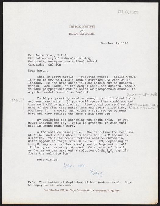 Crick, Francis. “Letter from Francis Crick to Aaron Klug, October 7, 1976,” October 7, 1976. History of Molecular Biology Collection, Box 19, Folder 25. Science History Institute. Philadelphia. https://digital.sciencehistory.org/works/aw55uot.
