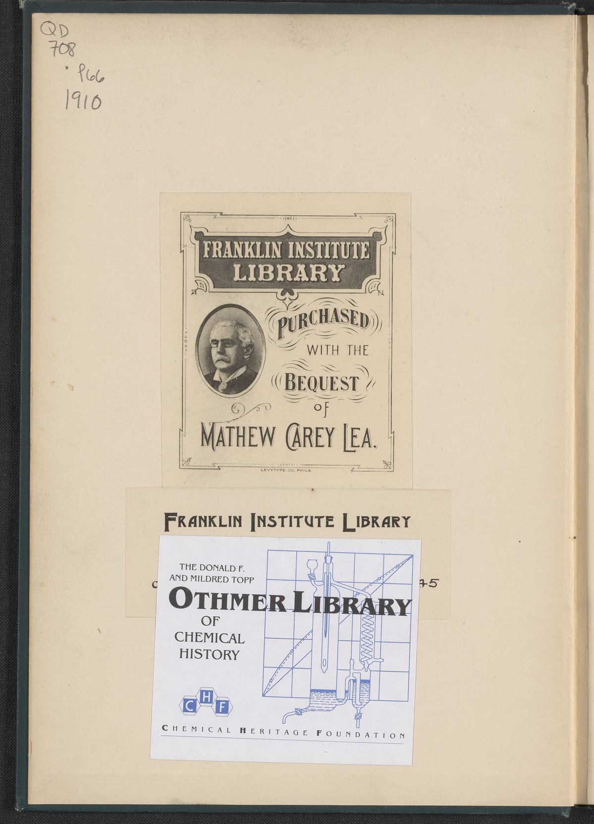 Plotnikov, I. S. (Ivan Stepanovich). “Photochemie [Bookplate Featuring Matthew Carey Lea].” Halle an der Saale, Germany: W. Knapp, 1910. QD708 .P66 1910. Science History Institute. Philadelphia. https://digital.sciencehistory.org/works/awm78yy.
