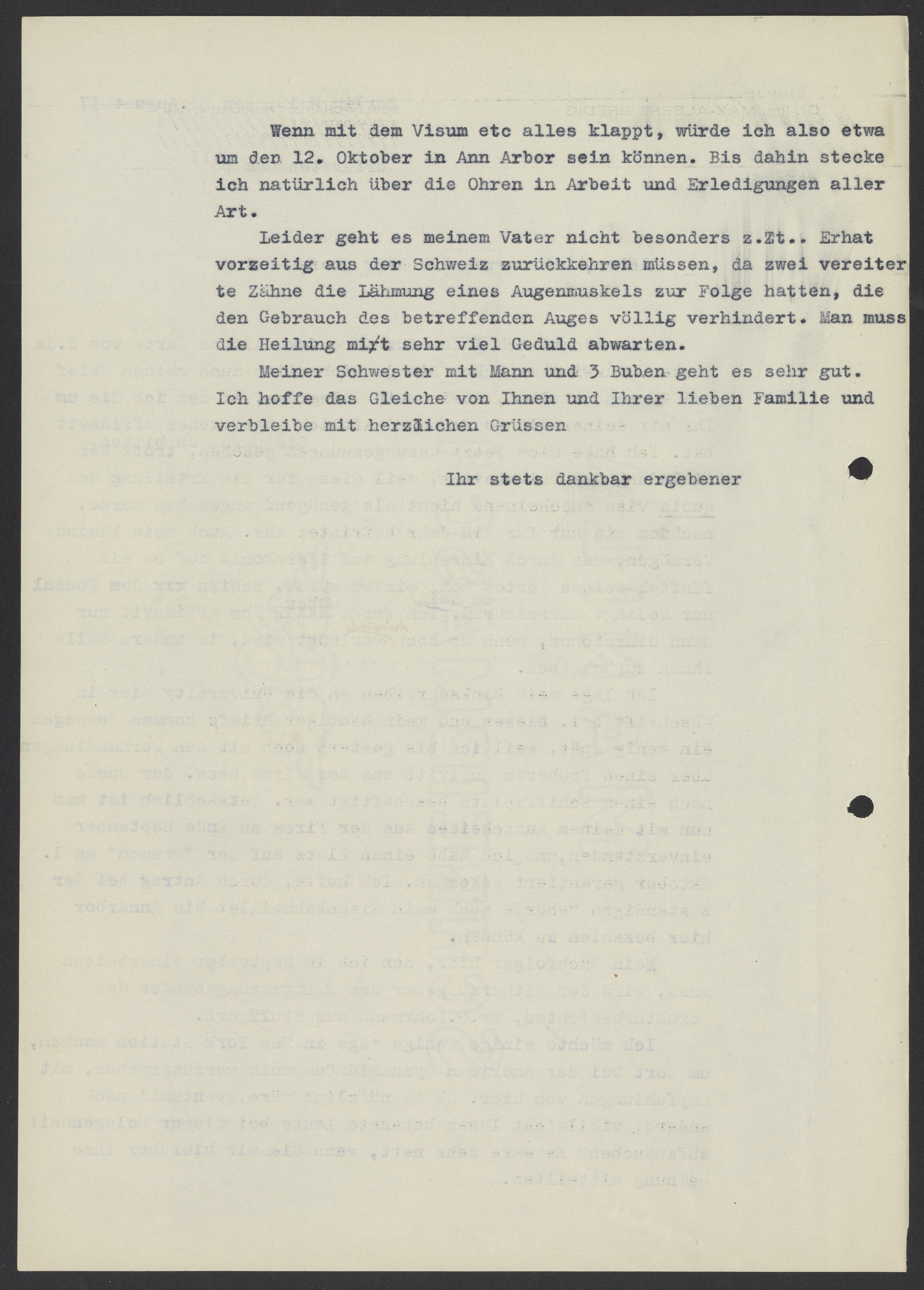 Ich lege mein Dankschrieben an die University hier in Abschrift bei. Dieses und mein heutiger Brief kommen deswegen ein wenig spät, weil ich bis gestern noch mit den Verhandlungen über einen früheren Austritt aus der Firma bezw. der Suche nach einen Schiffsplatz beschäftigt war. Tatsächlich ist man nun mit meinen Ausscheiden aus der Firma zu Ende September einverstanden, und ich habe einen Platz auf der “Bremen” am 1. Oktober garantiert bekommen. Ich hoffe, durch Antrag bei der zuständigen Behörde auch mein Eisenbahnbillet bis Ann Arbor hier bezahlen zu können.