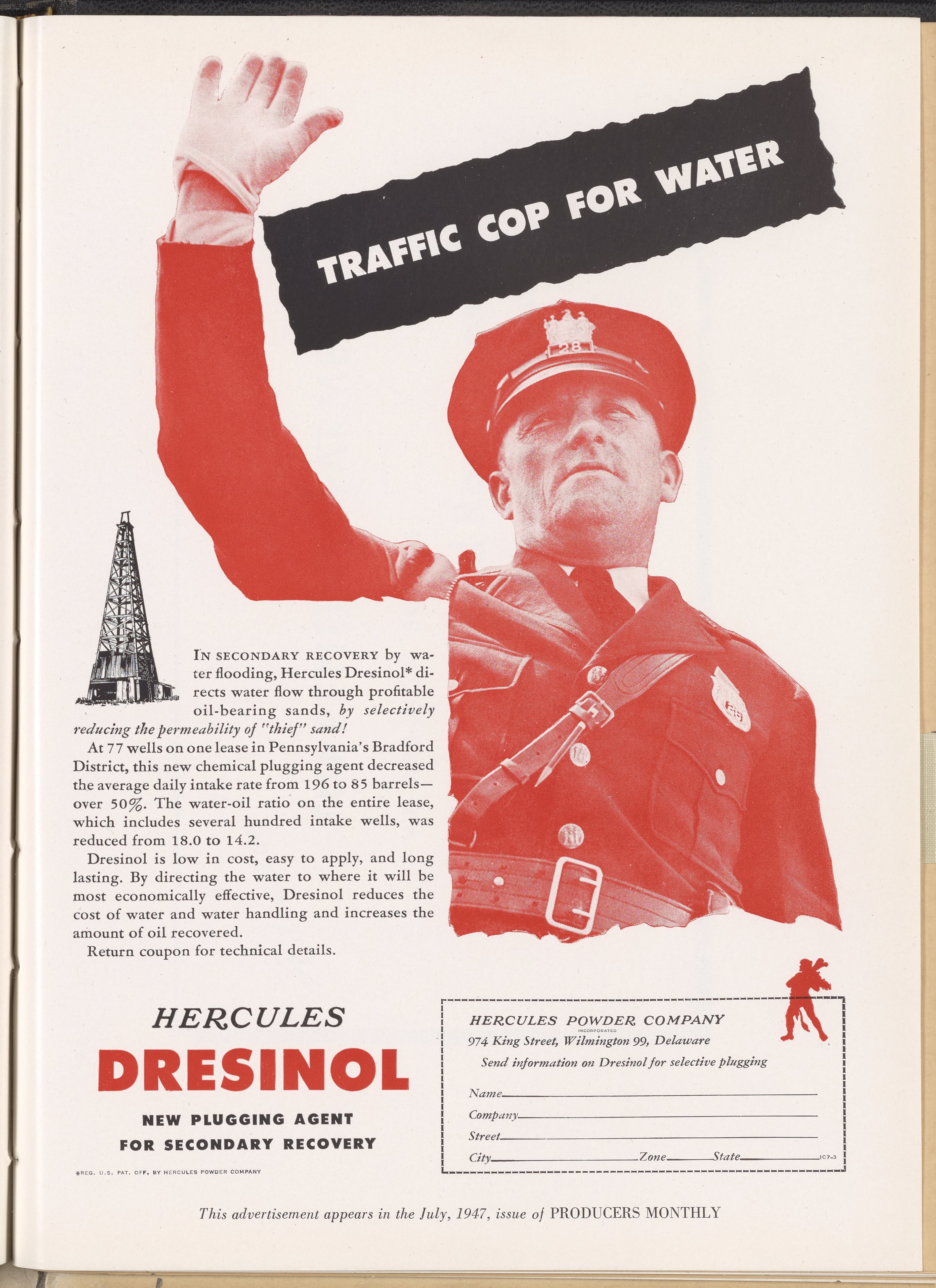 Hercules Incorporated. “Traffic Cop for Water.” 1947 Hercules Advertisements, 1947. Records of Hercules Incorporated, Volume 1947. Science History Institute. Philadelphia. https://digital.sciencehistory.org/works/azf68hs.