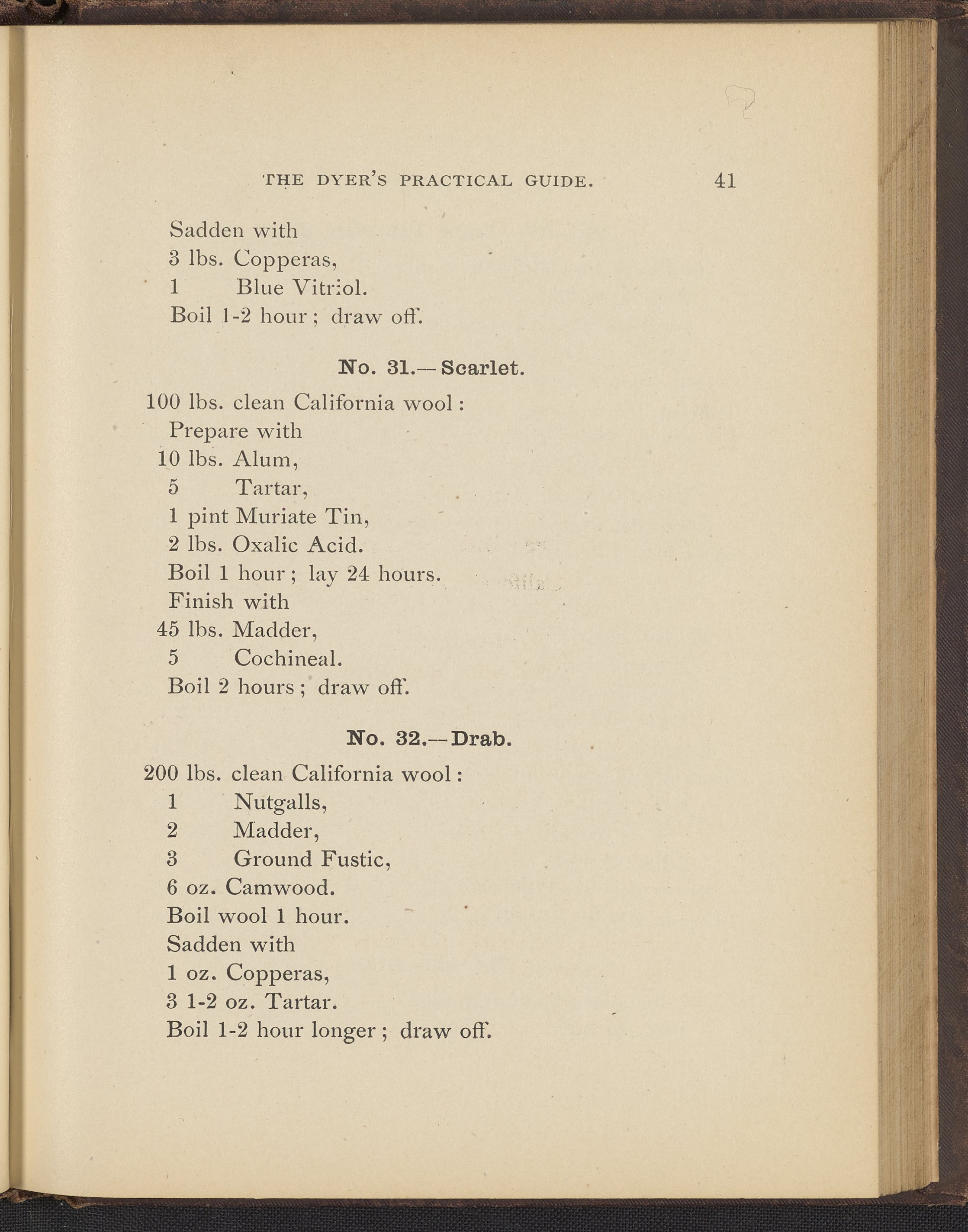 Small JPG1200 x 1496px — 493 KBFull-sized JPG2356 x 2937px — 1.7 MBOriginal fileTIFF — 2356 x 2937px — 19.8 MBTreatise containing "practical knowledge" on dyeing for manufacturers, with sections on mordants, chemicals used in dyeing, wool scouring, extracting cotton from wool, and 253 dye recipes for wool, cotton, and shoddy (recycled wool).