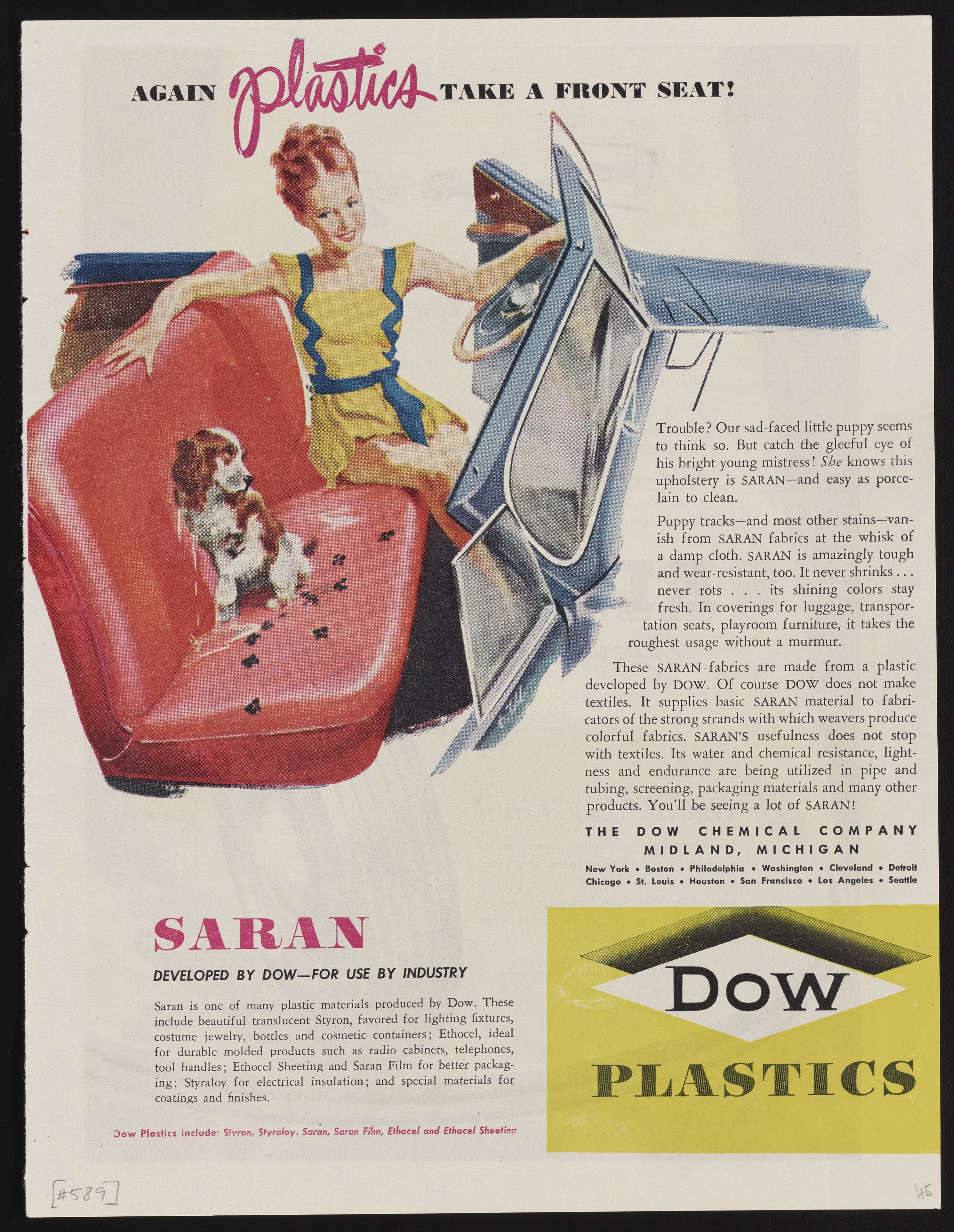 Dow Chemical Company. “Again Plastics Take a Front Seat!,” 1945. Advertisements from the Dow Chemical Historical Collection, Box 9. Science History Institute. Philadelphia. https://digital.sciencehistory.org/works/b0vilpt.