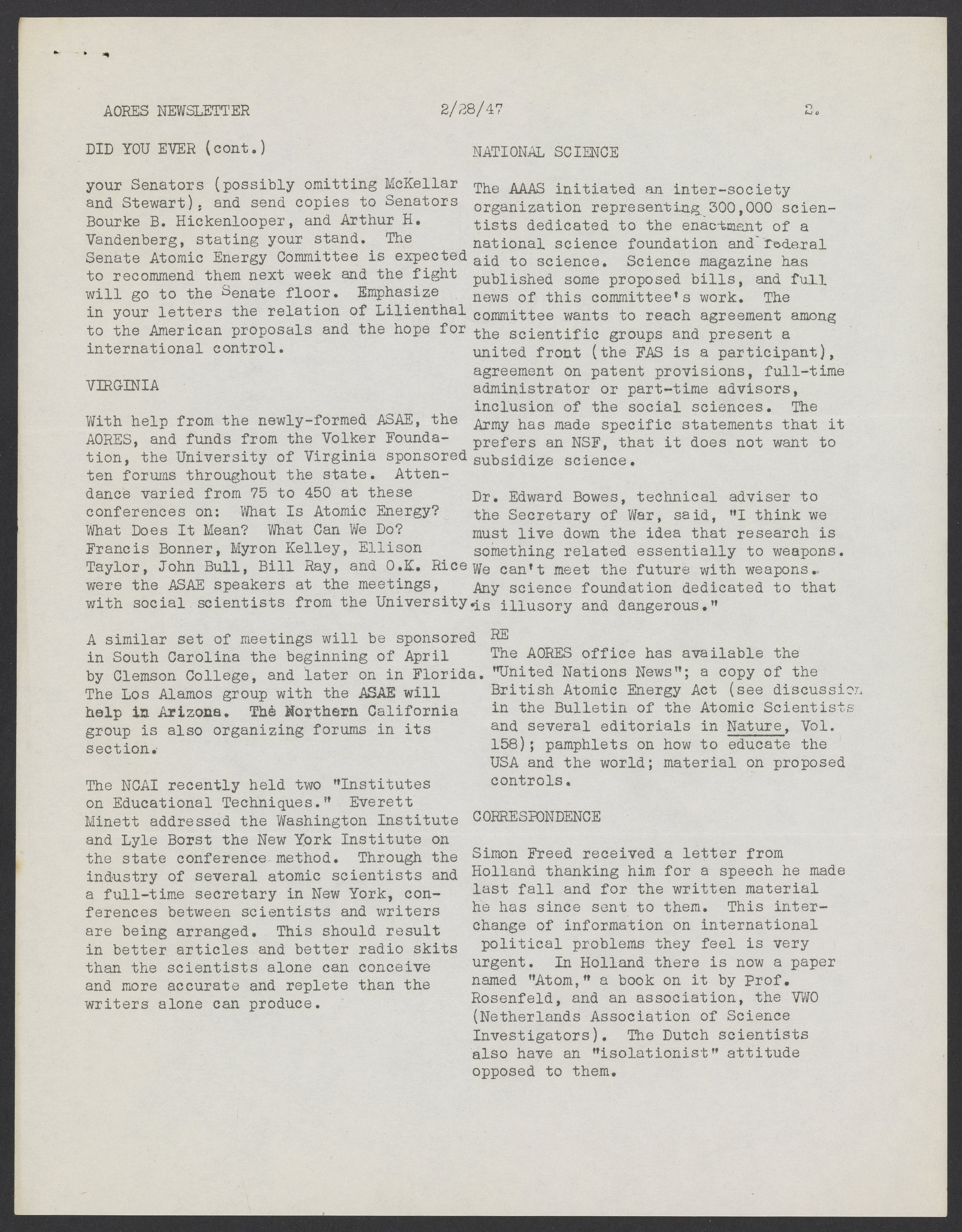 Association of Oak Ridge Engineers and Scientists. “Newsletter for the Association of Oak Ridge Engineers and Scientists (AORES), February 28, 1947,” February 28, 1947. Papers of Georg and Max Bredig, Box 10, Folder 4. Science History Institute. Philadelphia. https://digital.sciencehistory.org/works/b264vru.