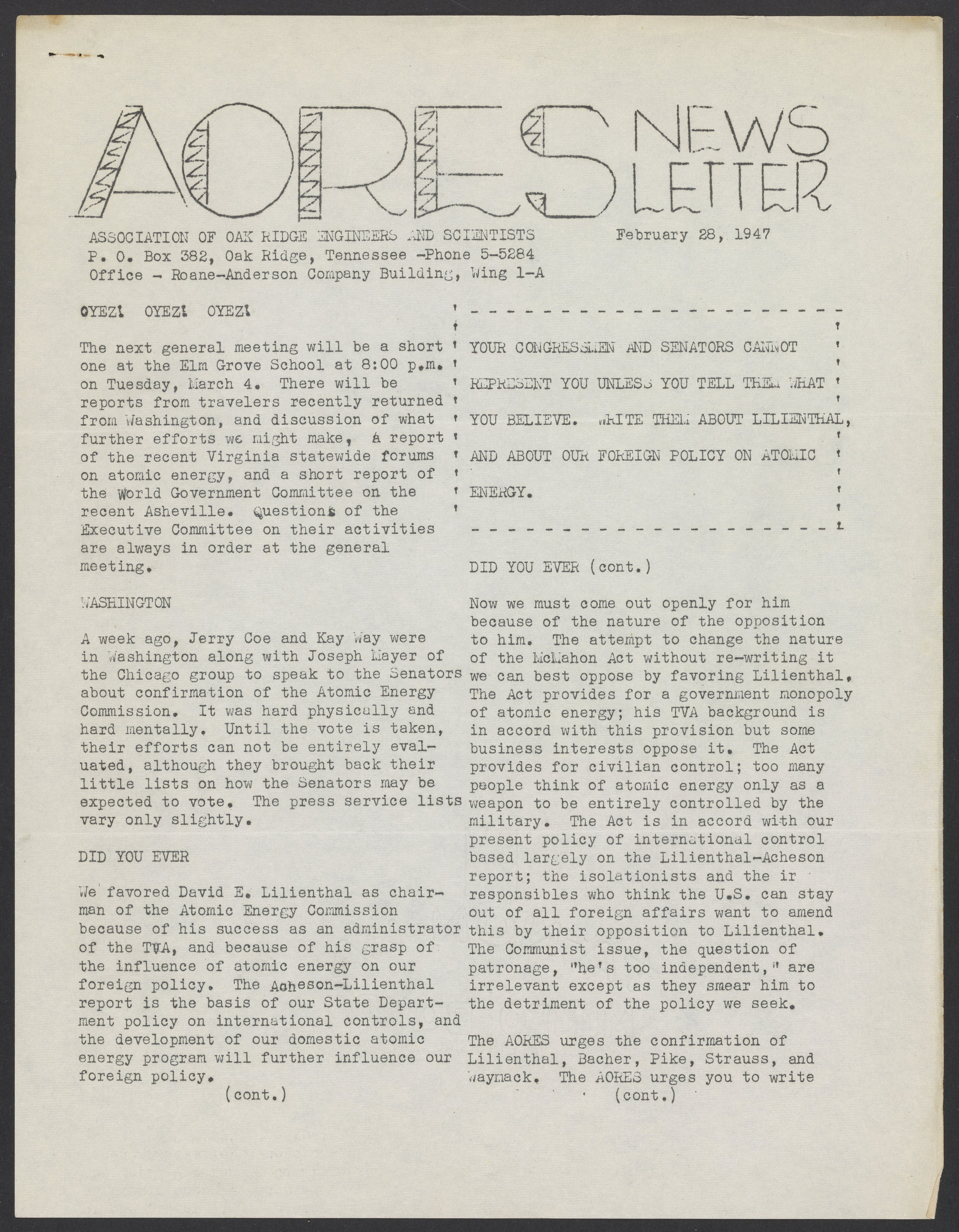 Newsletter for the Association of Oak Ridge Engineers and Scientists (AORES), February 28, 1947