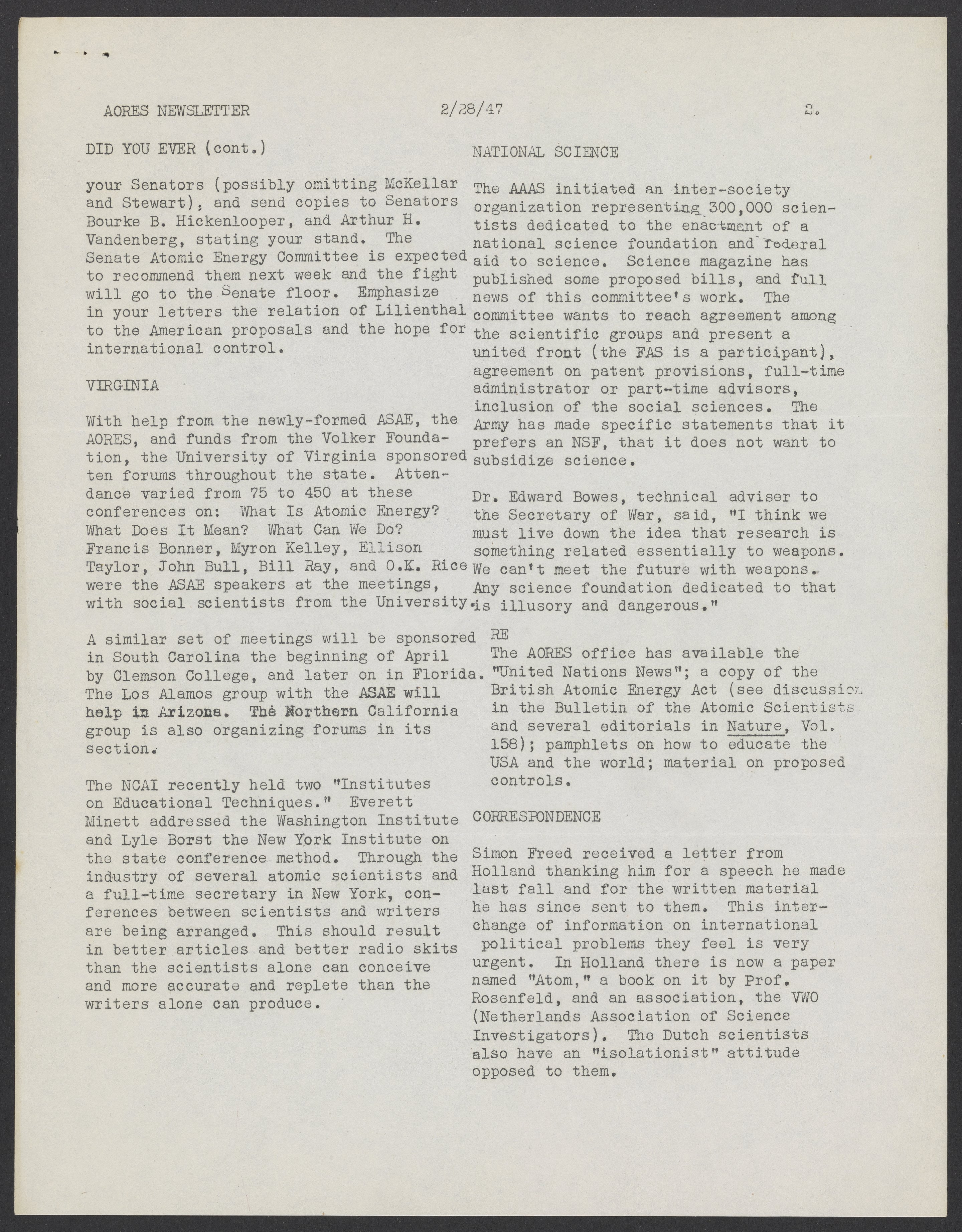 Association of Oak Ridge Engineers and Scientists. “Newsletter for the Association of Oak Ridge Engineers and Scientists (AORES), February 28, 1947,” February 28, 1947. Papers of Georg and Max Bredig, Box 10, Folder 4. Science History Institute. Philadelphia. https://digital.sciencehistory.org/works/b264vru.