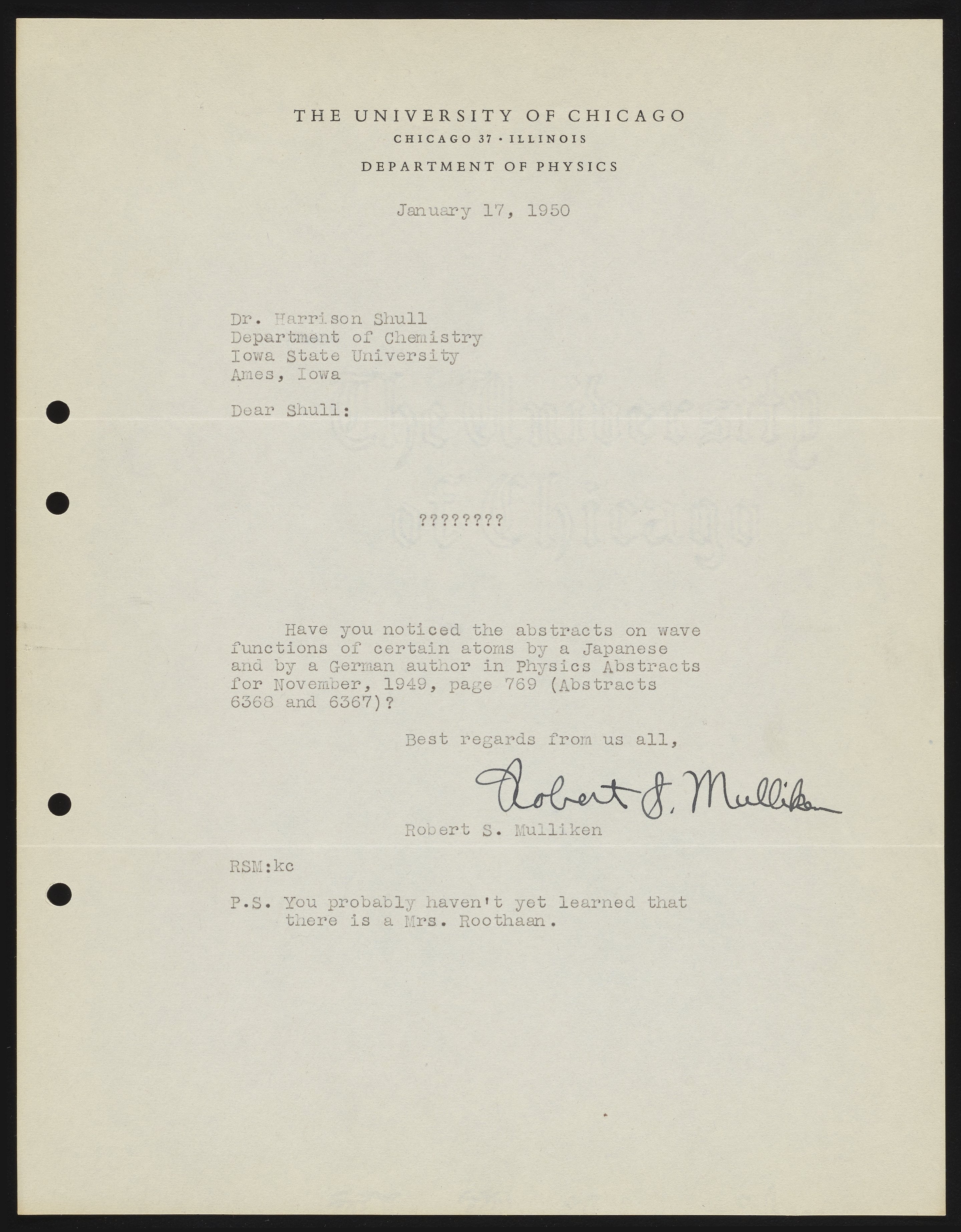 Mulliken, Robert Sanderson. “Letter from Robert S. Mulliken to Harrison Shull, 1950,” January 17, 1950. Robert S. Mulliken & Harrison Shull Correspondence, Box 1. Science History Institute. Philadelphia. https://digital.sciencehistory.org/works/b2773v766.