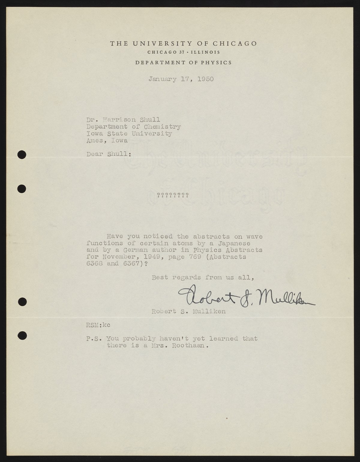 Letter from Robert S. Mulliken to Harrison Shull, 1950