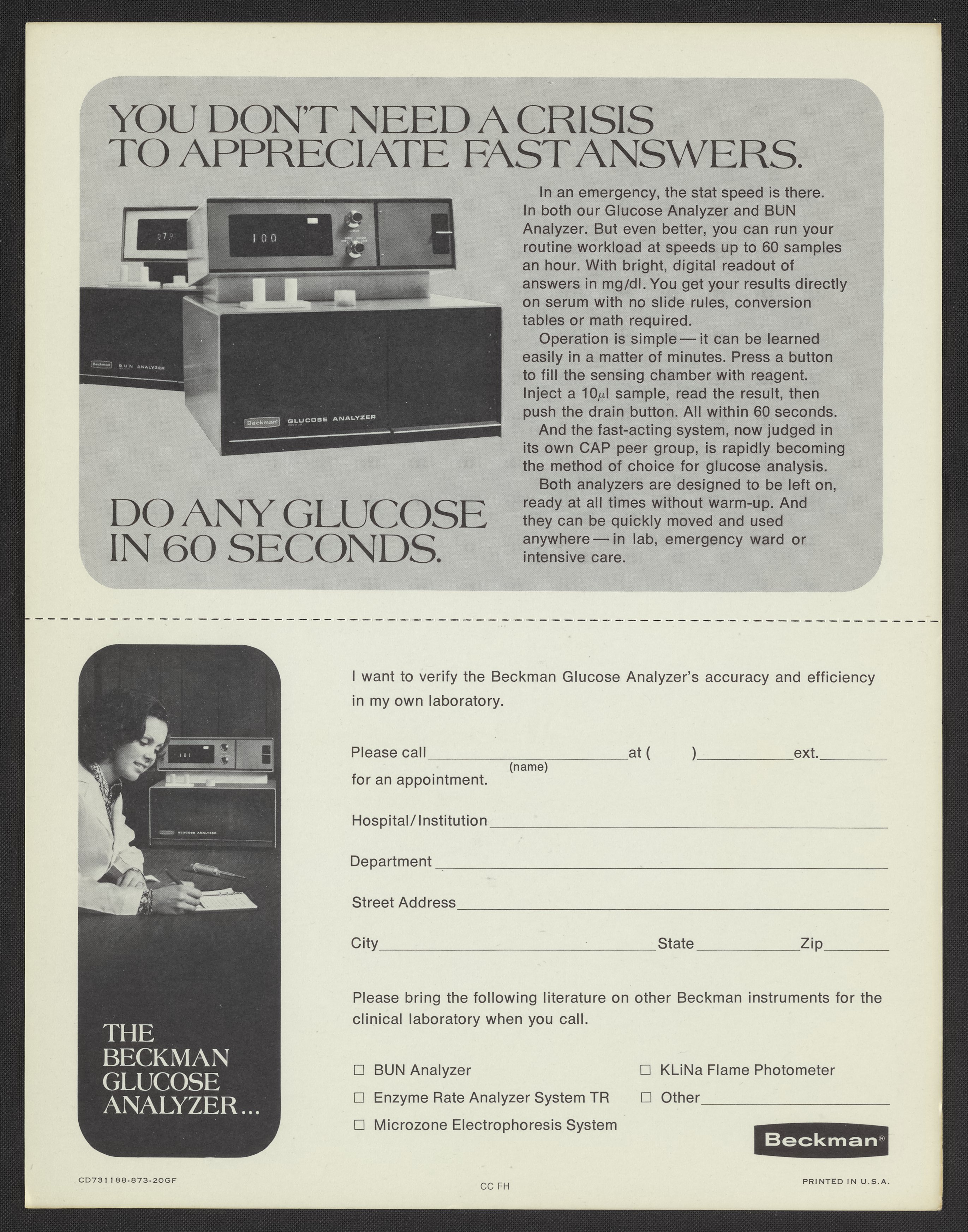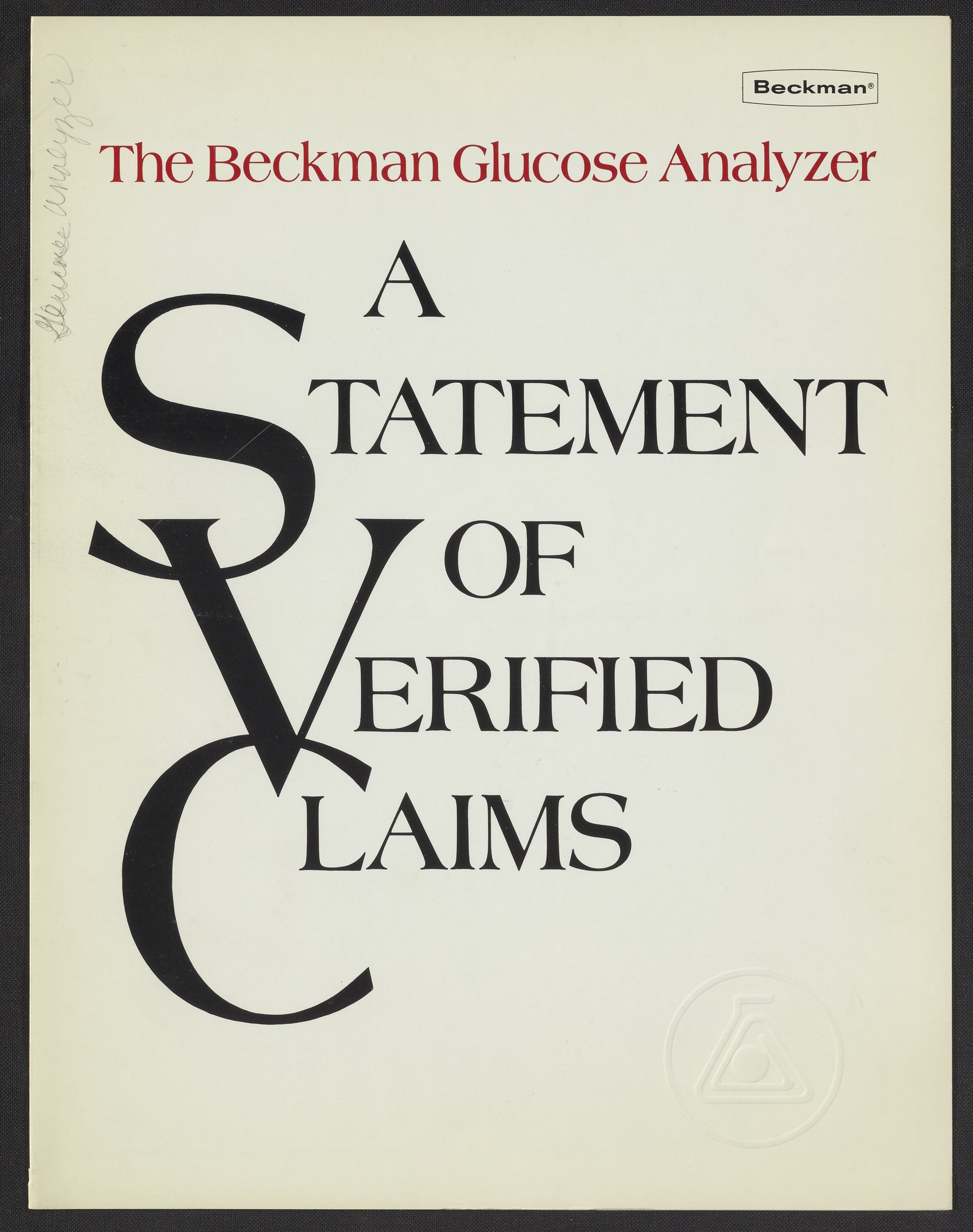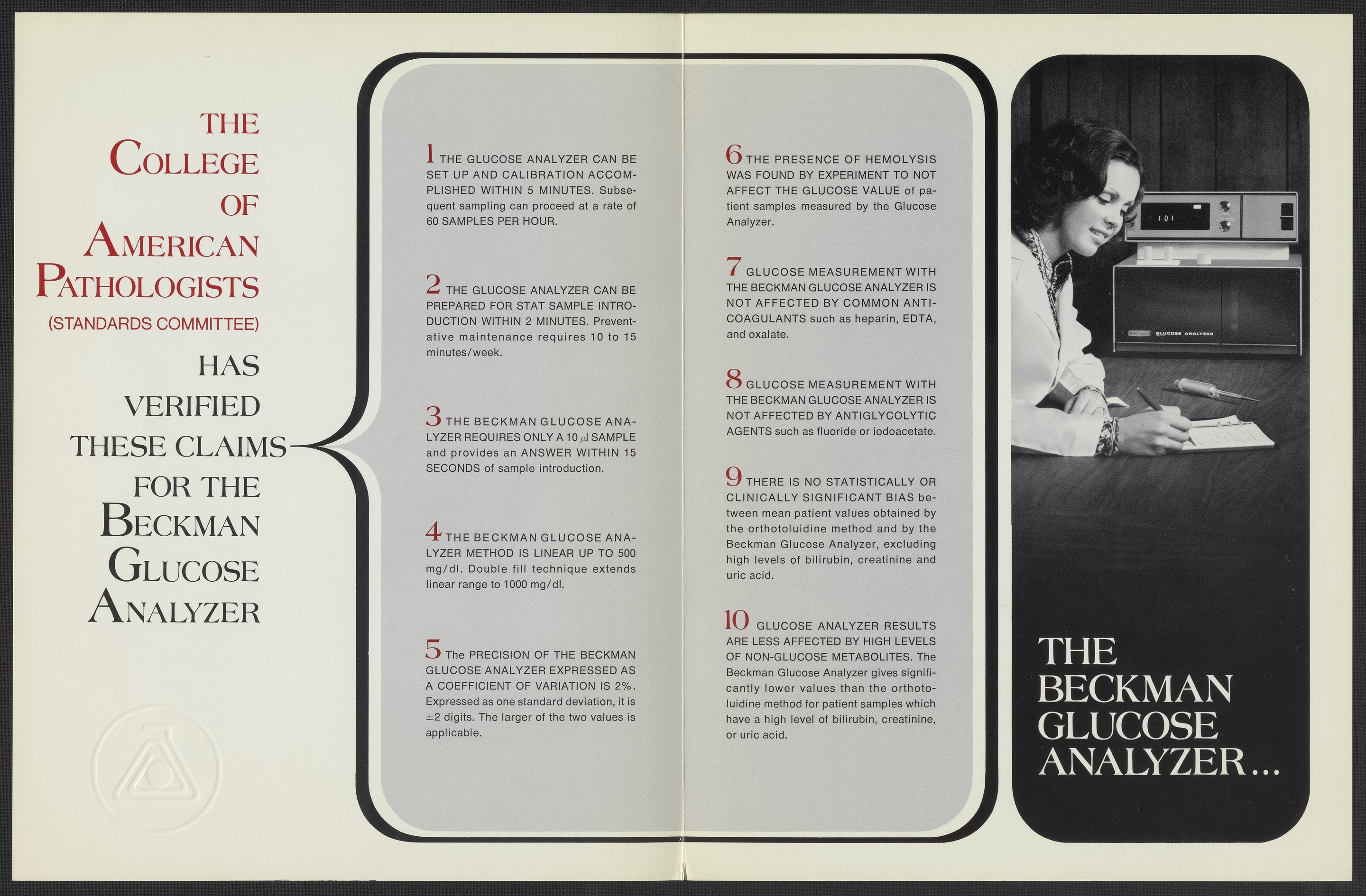 Beckman Instruments, Inc. “The Beckman Glucose Analyzer: A Statement of Verified Claims,” 1970. Beckman Historical Collection, Box 17, Folder 30. Science History Institute. Philadelphia. https://digital.sciencehistory.org/works/b2773w23c.