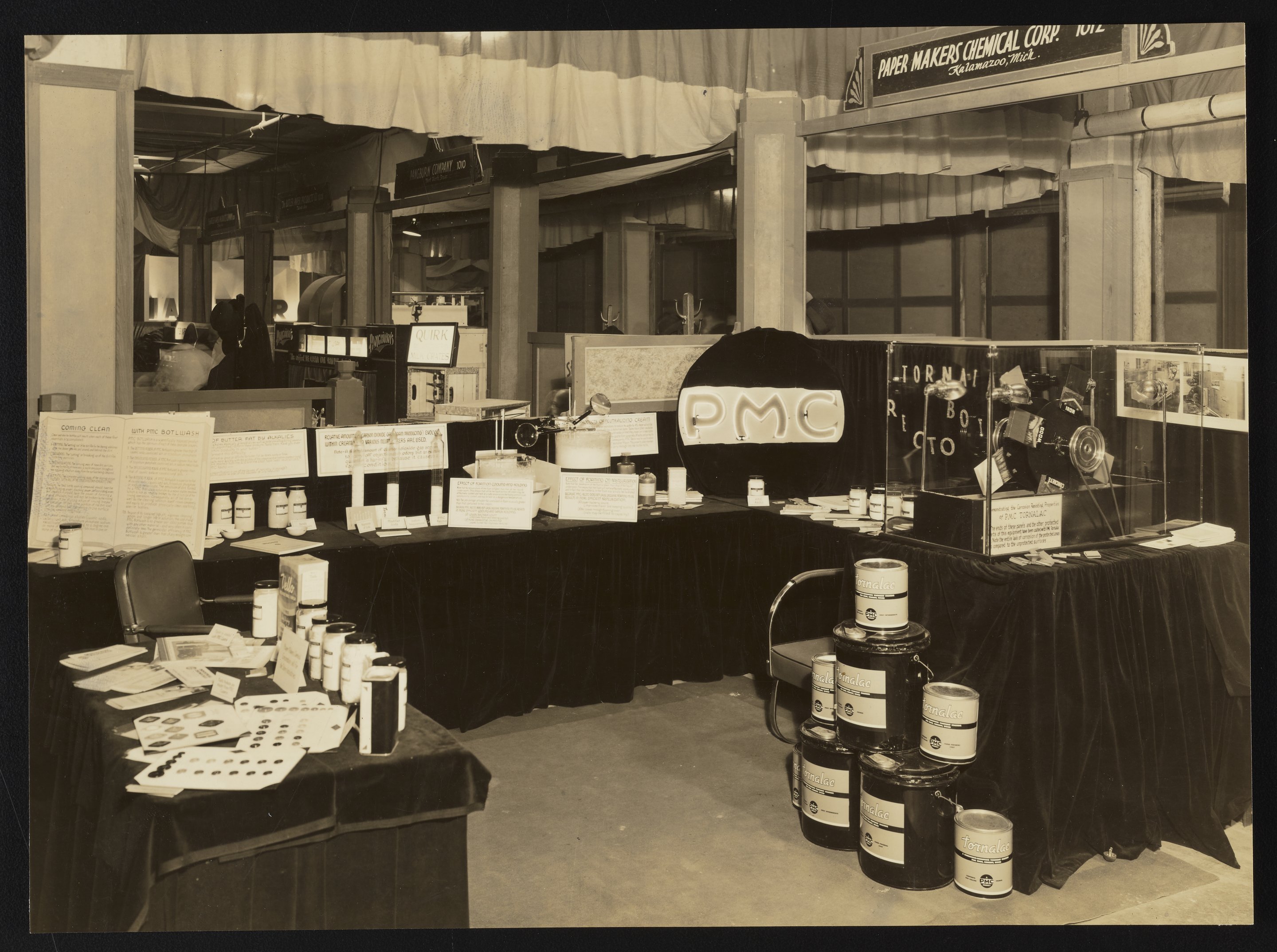 General view of the Paper Makers Chemical Corporation exhibition display at a Dairy Industries Exposition held in Atlantic City, New Jersey. Based in Kalamazoo, Michigan, the Paper Makers Chemical Corporation operated as a subsidiary of the Hercules Powder Company.