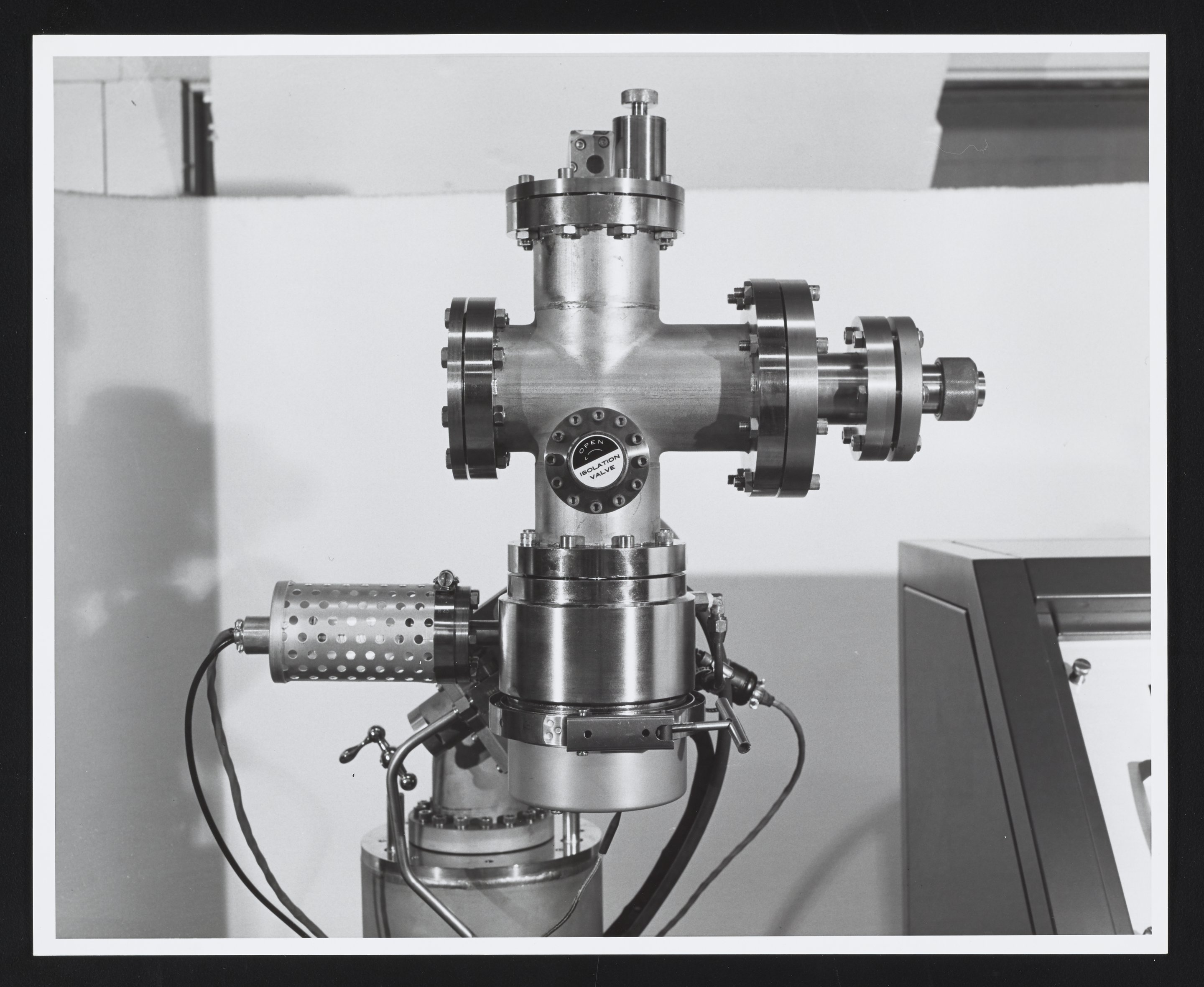 Close-up view of the isolation valve apparatus for a Bendix Corporation Knudsen Cell Inlet System. Inlet systems are typically used to introduce samples into a mass spectrometer's ion source for analysis. The Knudsen Cell Inlet System allowed for rapid quantitative determinations of molecular weights and heats of vaporization, as well as qualitative determinations of molecular species in gas phase.