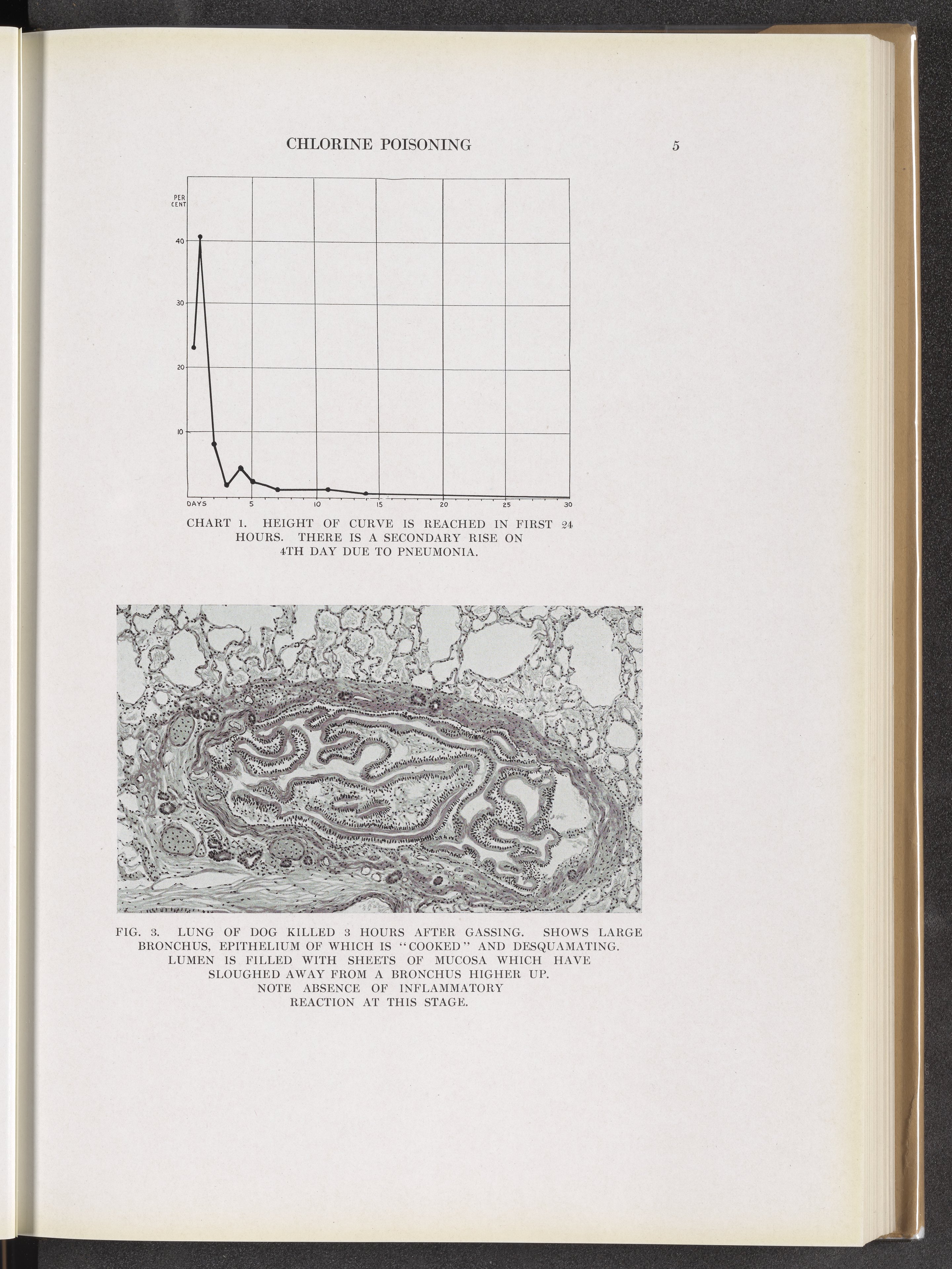 Chart 1: Height of curve is reached in first 24 hours. Fig. 3: Lung of dog killed three hours after gassing.