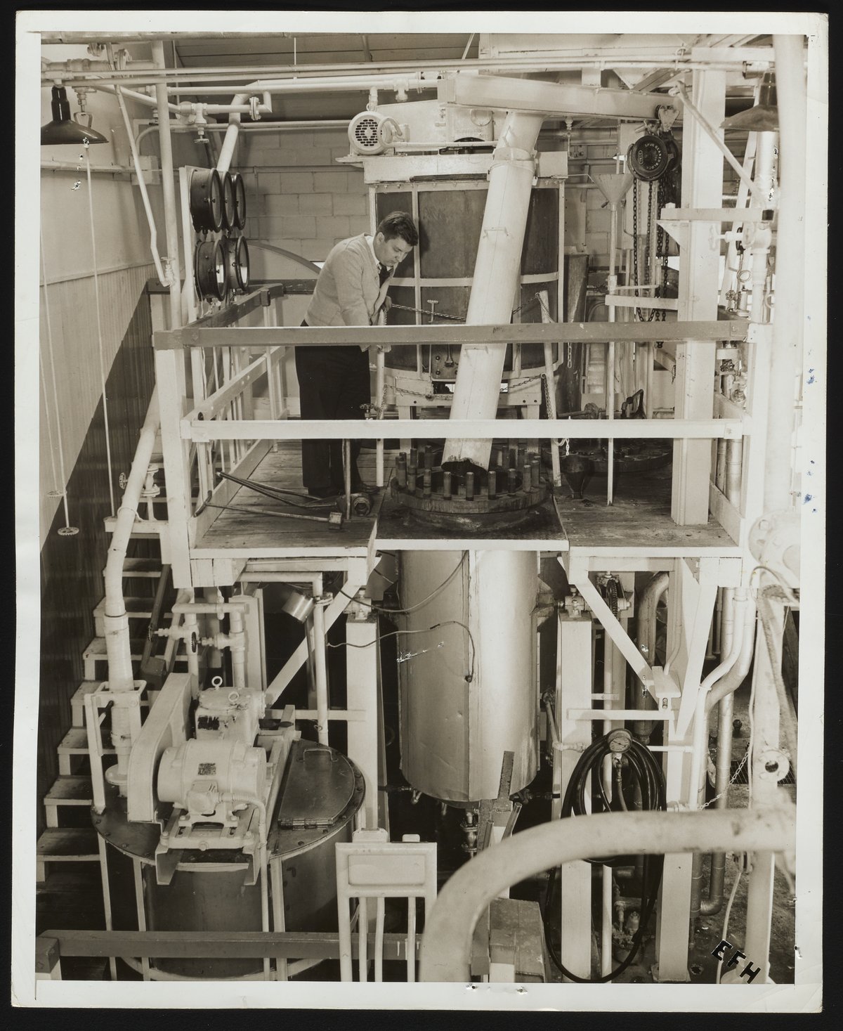 Interior view of a Hercules Powder Company linter pilot plant in Hopewell, Virginia, with view of a small digester and wash tubs. The pilot plant was likely designed as a facility for the removal of short fibers from cotton seeds during the production of so-called "chemical cotton," a type of purified cellulose obtained from raw cotton linters. The employee visible in the photograph is identified as F.C. Ponko.