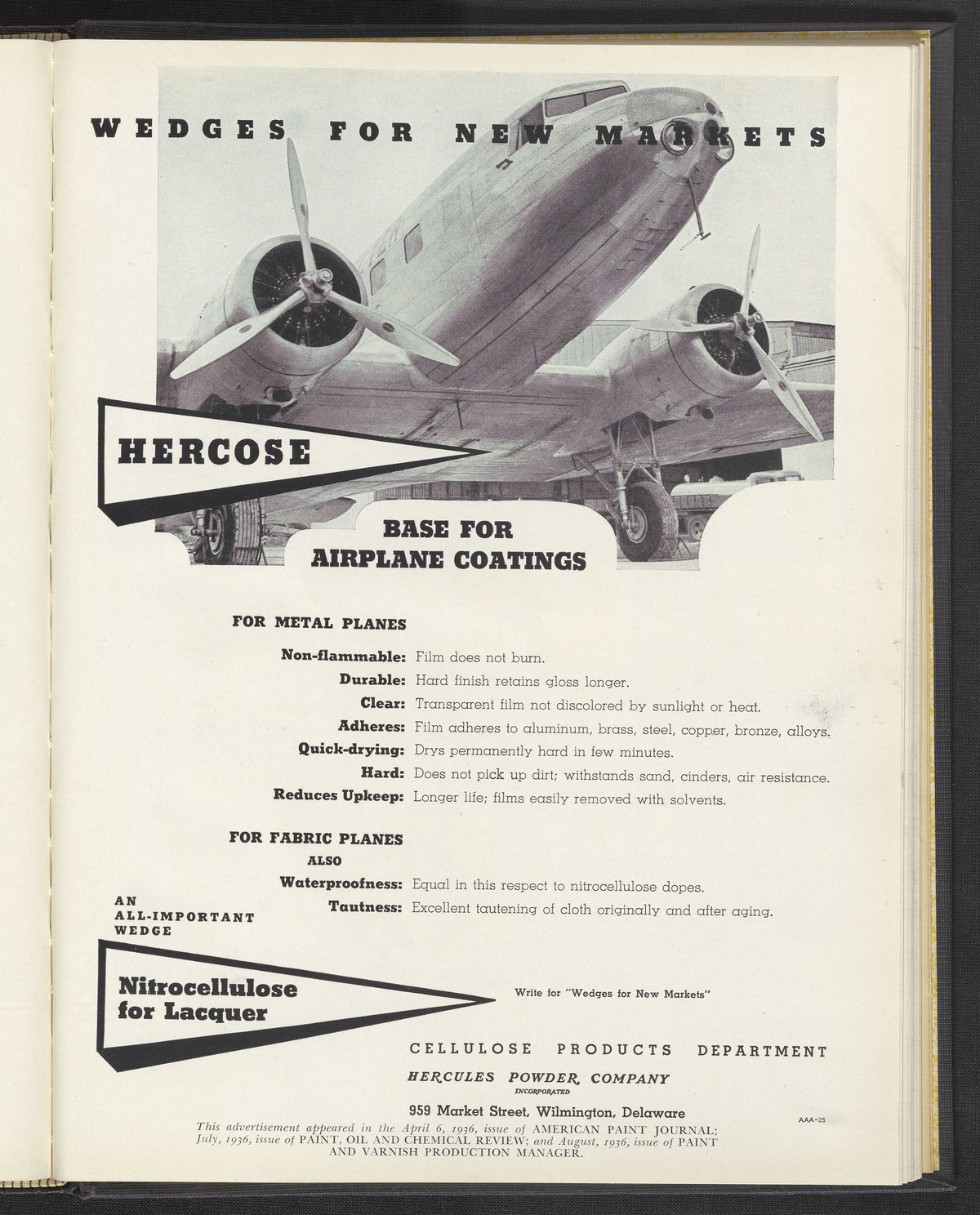 Hercules Incorporated. “Wedges for New Markets: Hercose Base for Airplane Coatings.” 1936 Hercules Advertisements, 1936. Records of Hercules Incorporated, Volume 1936. Science History Institute. Philadelphia. https://digital.sciencehistory.org/works/b5644s37z.