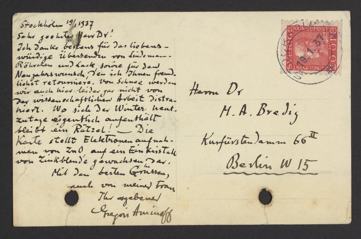Postcard from Gregori Aminoff to Max Bredig, January 1937