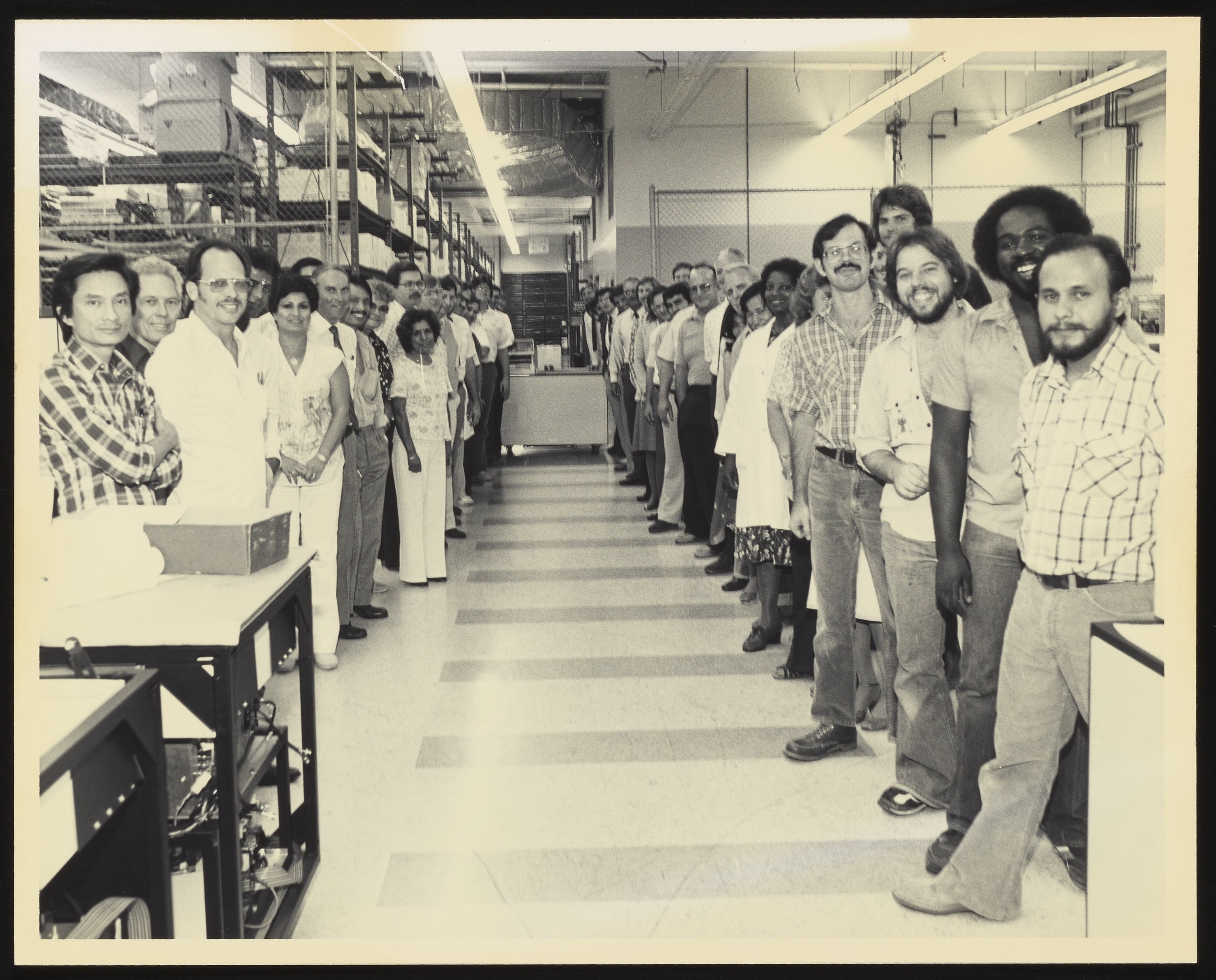 Unidentified Beckman Instruments employees who worked on the LS 9800 liquid scintillation counter. Liquid scintillation counters measure the radioactivity of a sample by mixing the sample with a solvent containing a scintillator, which will emit photons in the presence of radioactive materials. The counter measures the pulses of photons as wavelengths of light detected through phototubes.