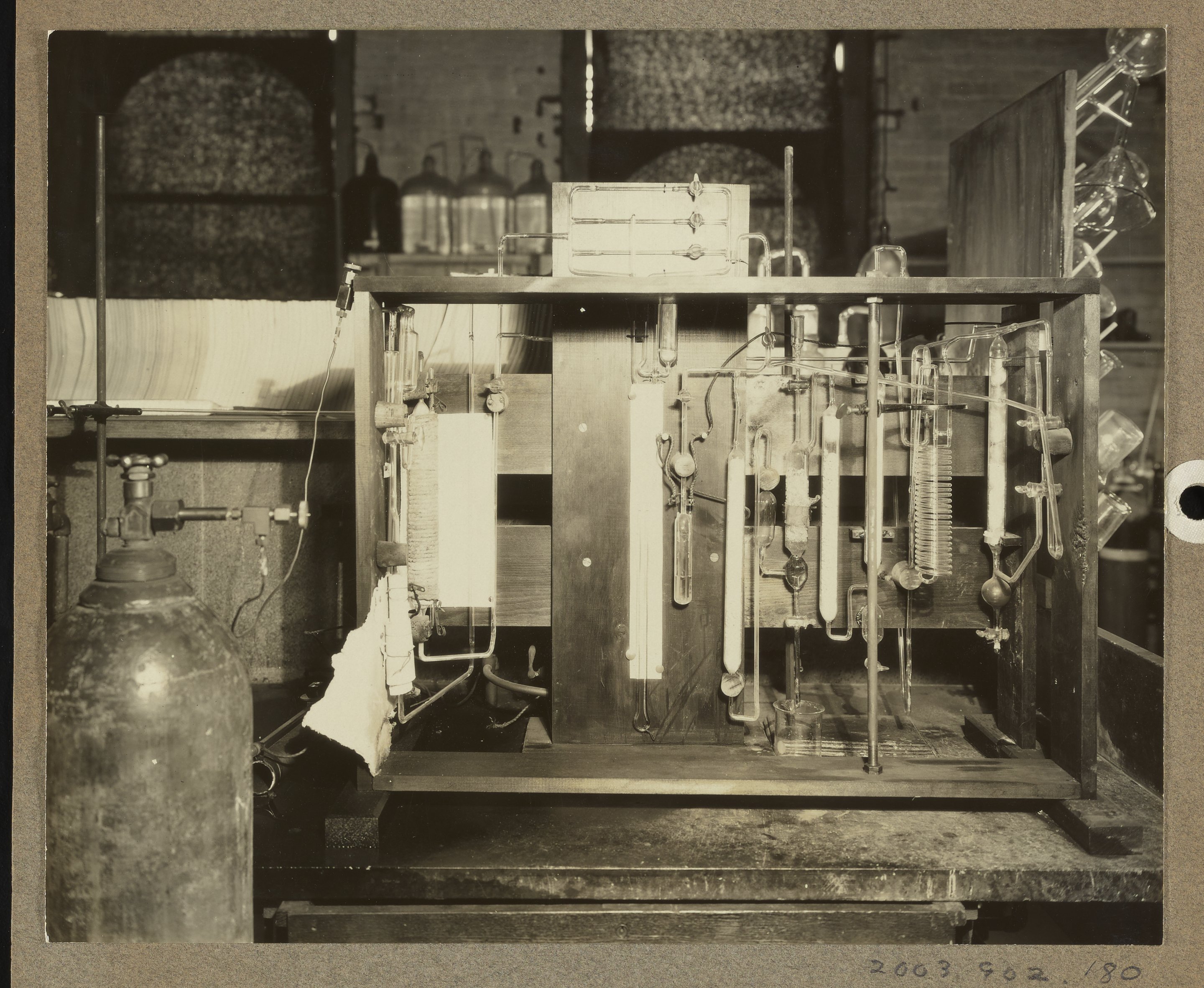 “Gas Purification Rack,” January 8, 1930. Travis P. Hignett Collection of Fixed Nitrogen Research Laboratory Photographs, Box 2. Science History Institute. Philadelphia. https://digital.sciencehistory.org/works/b8515n45p.