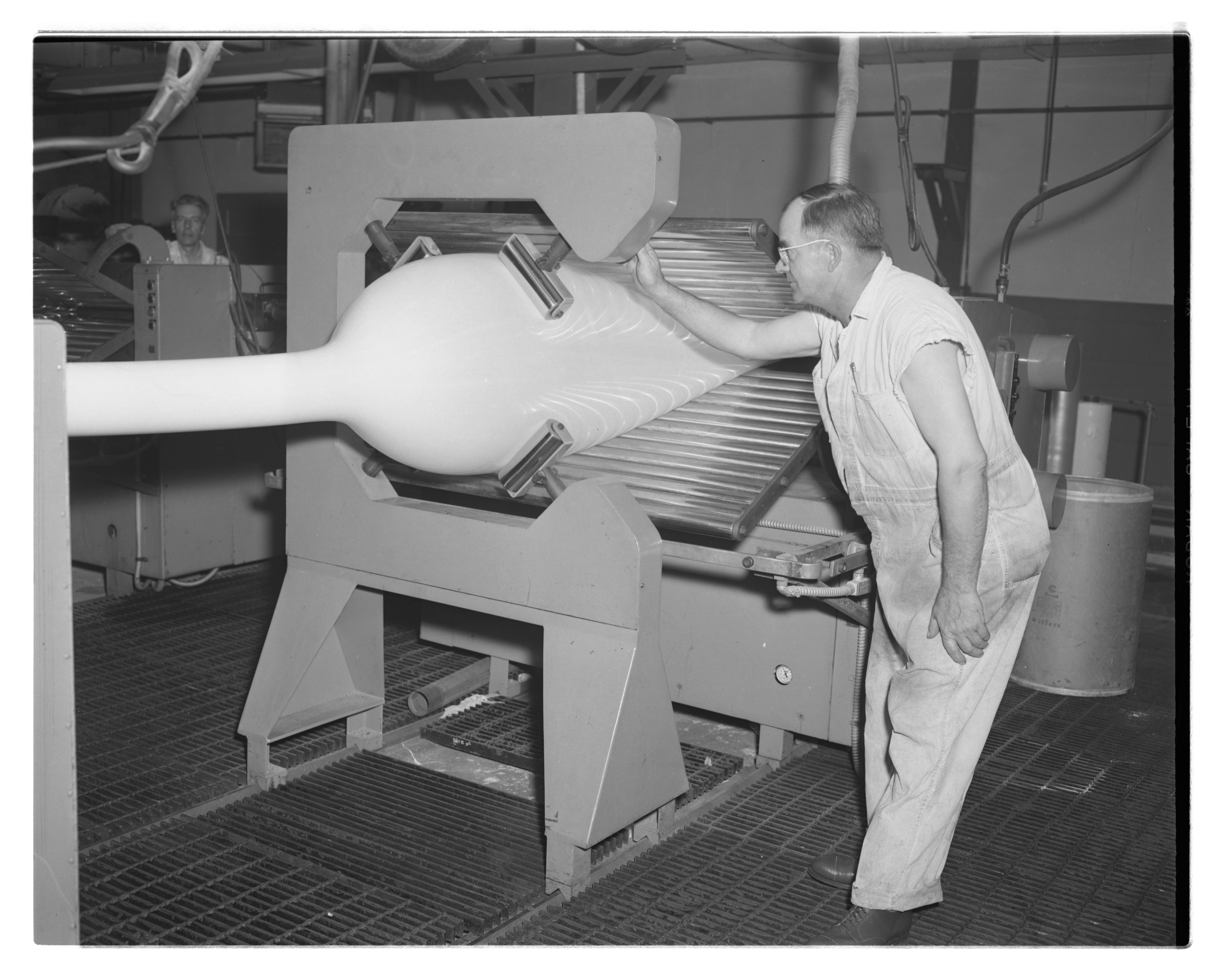 General view of an unidentified employee inspecting a saran bubble as it is extruded from a machine during the production of saran film at the Dow Chemical Company plant in Midland, Michigan. During production, the film passed through a series of rollers, which deflated the bubbles and prepared the film for winding on rolls. Initially developed for the U.S. Army to wrap arms and equipment for transport during World War II, saran plastic was subsequently developed and marketed as Saran Wrap for household use.