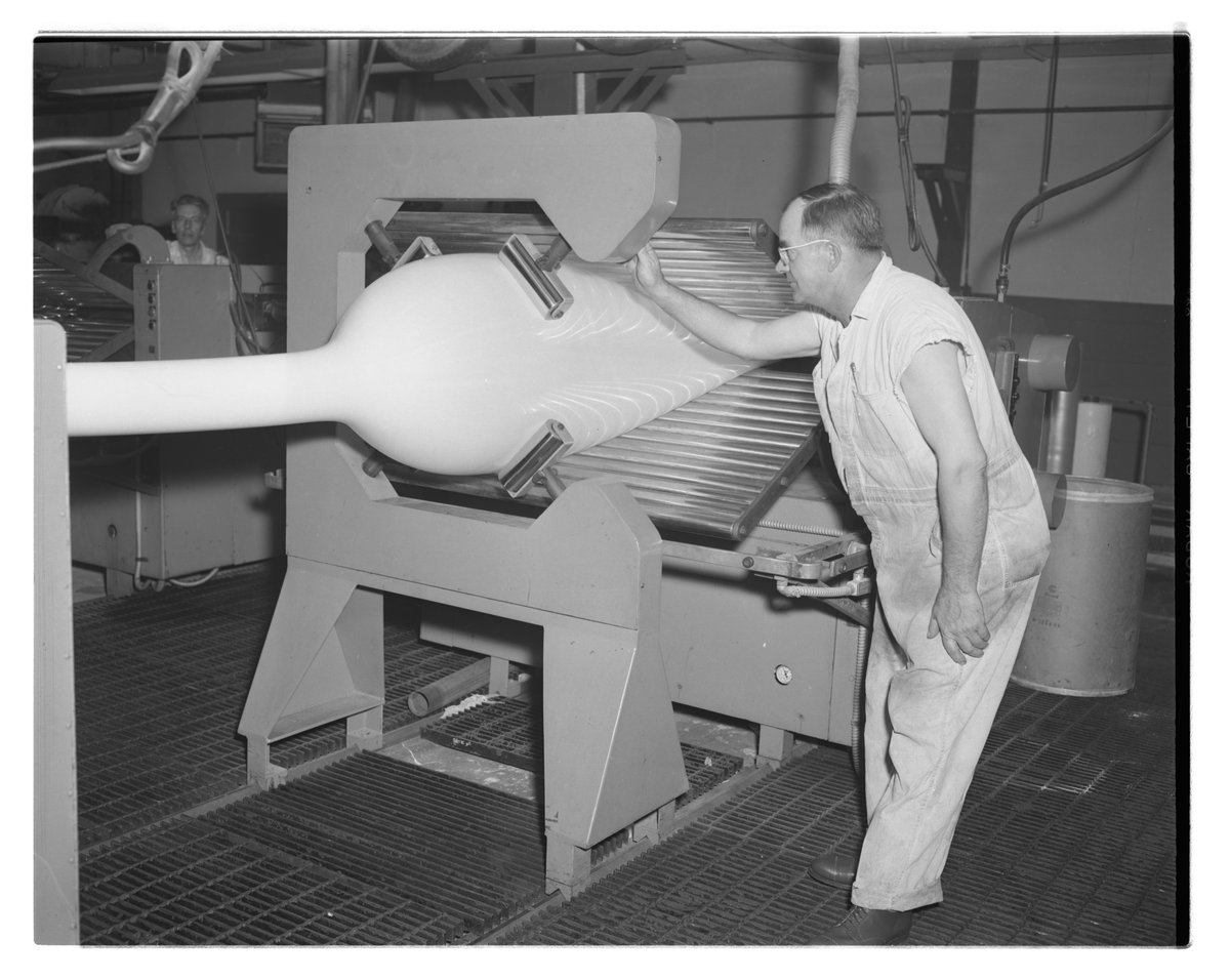 General view of an unidentified employee inspecting a saran bubble as it is extruded from a machine during the production of saran film at the Dow Chemical Company plant in Midland, Michigan. During production, the film passed through a series of rollers, which deflated the bubbles and prepared the film for winding on rolls. Initially developed for the U.S. Army to wrap arms and equipment for transport during World War II, saran plastic was subsequently developed and marketed as Saran Wrap for household use.