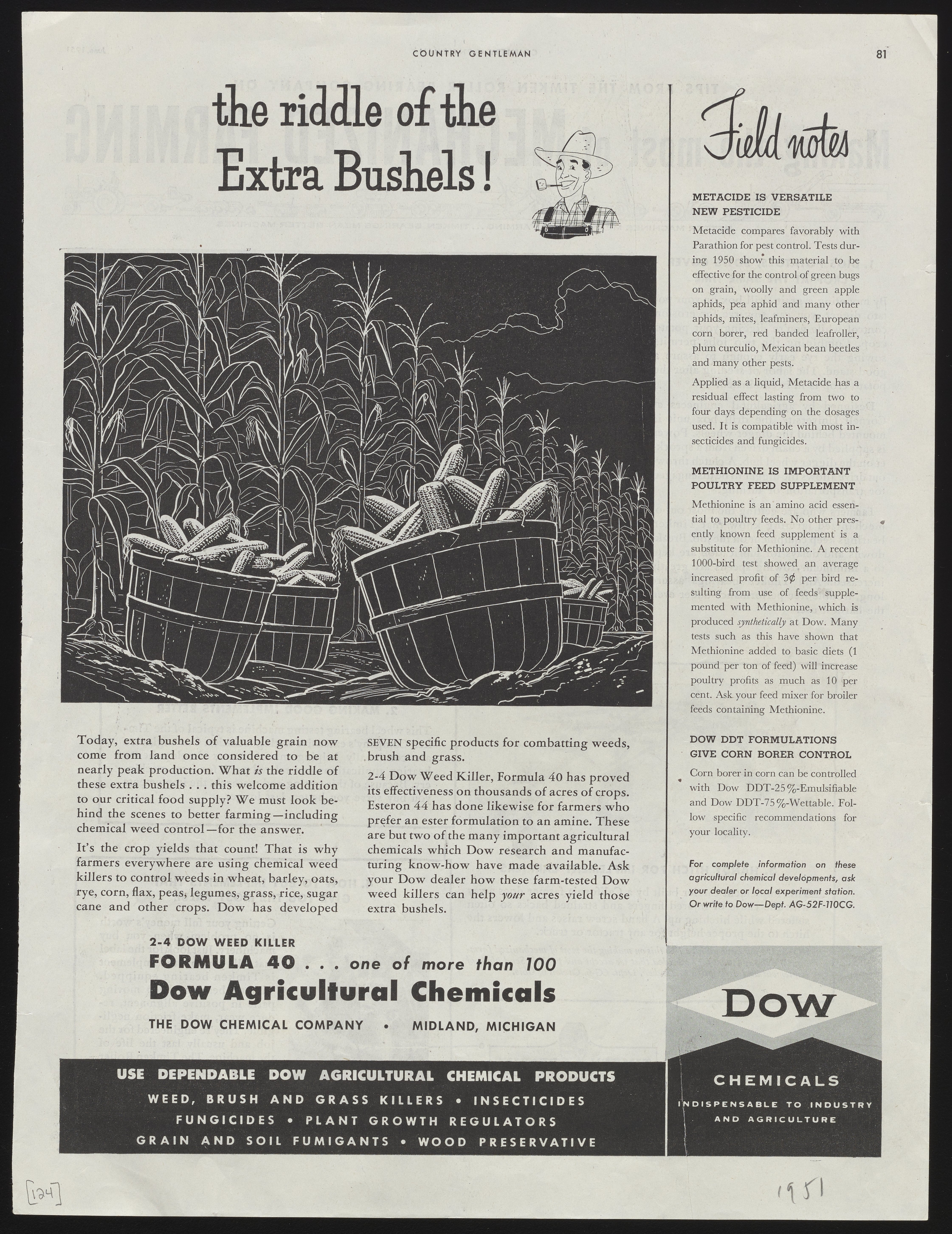 Black and white print advertisement for a range of agricultural chemicals manufactured and sold by the Dow Chemical Company, including weed killers, insecticides, fungicides, plant growth regulators, and grain and soil fumigants. The advertisement features an illustration of corn stalks and bushels, with accompanying text detailing how the use of Dow products leads to better crop yields. This advertisement appeared on page 81 of the June 1951 edition of Country Gentleman.