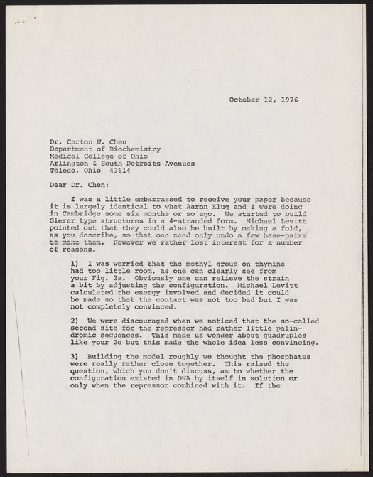 Crick, Francis. “Letter from Francis Crick to Carton W. Chen, October 12, 1976,” October 12, 1976. History of Molecular Biology Collection, Box 19, Folder 25. Science History Institute. Philadelphia. https://digital.sciencehistory.org/works/b87nkgf.
