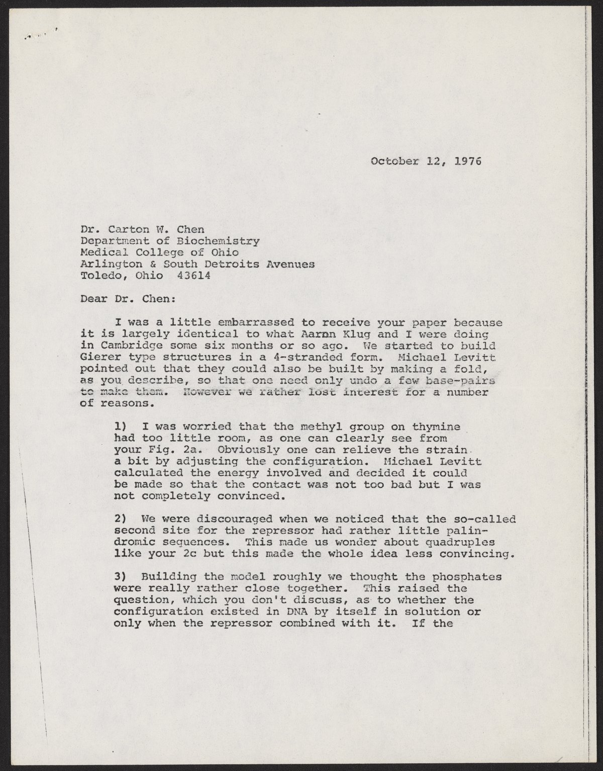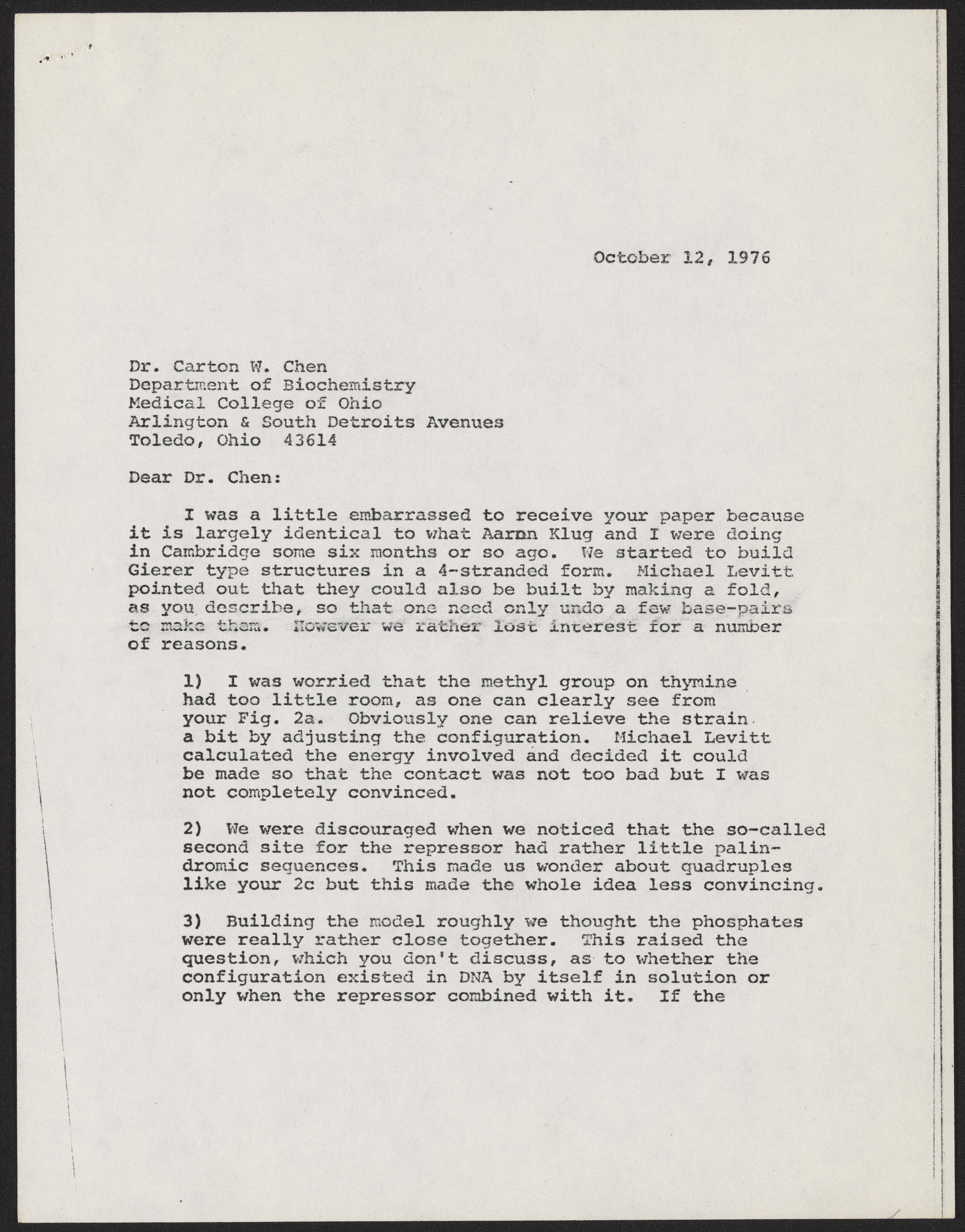 Letter from Francis Crick to Carton W. Chen, October 12, 1976