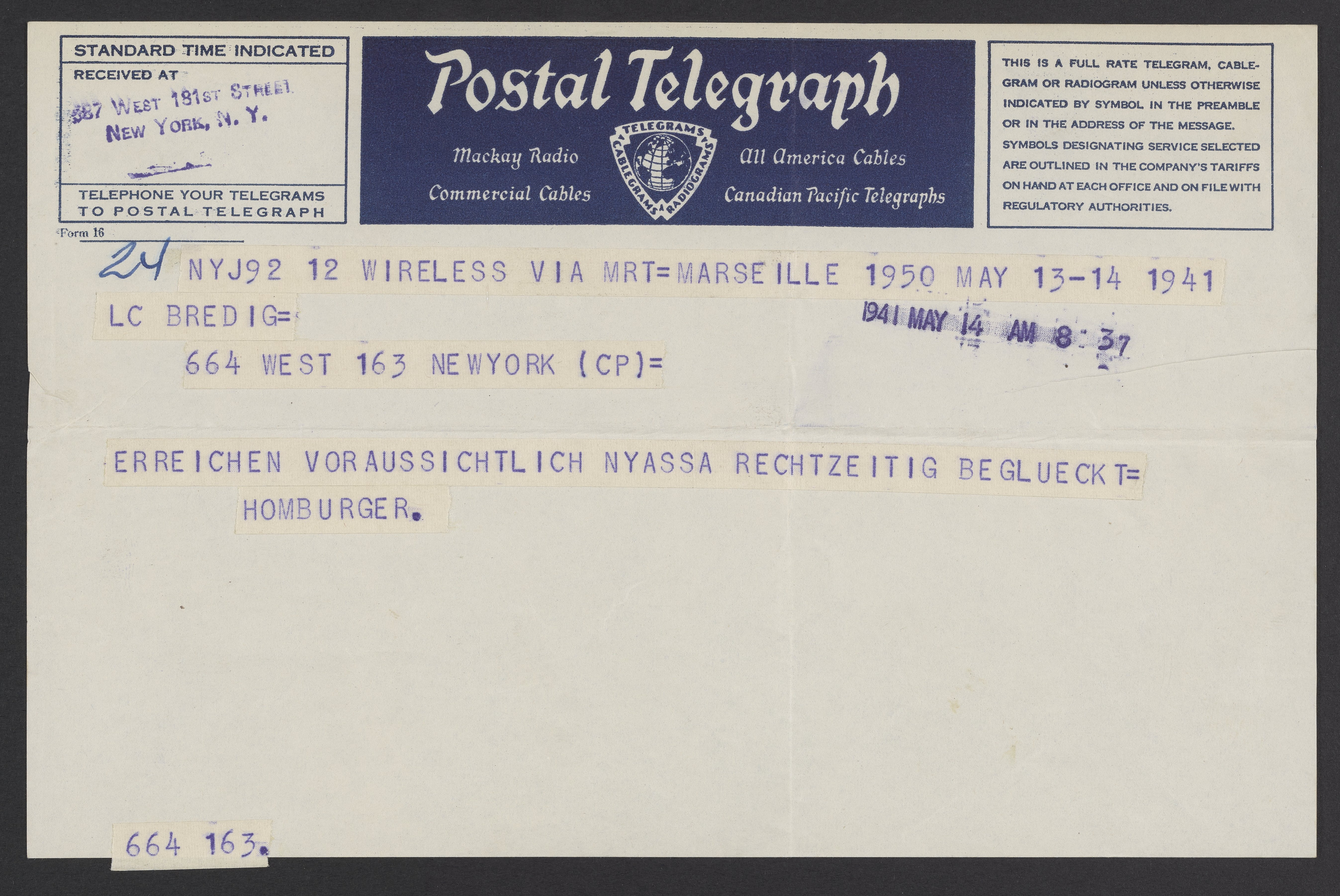 Telegraph to Max Bredig from Marianne Homburger, May 13, 1941