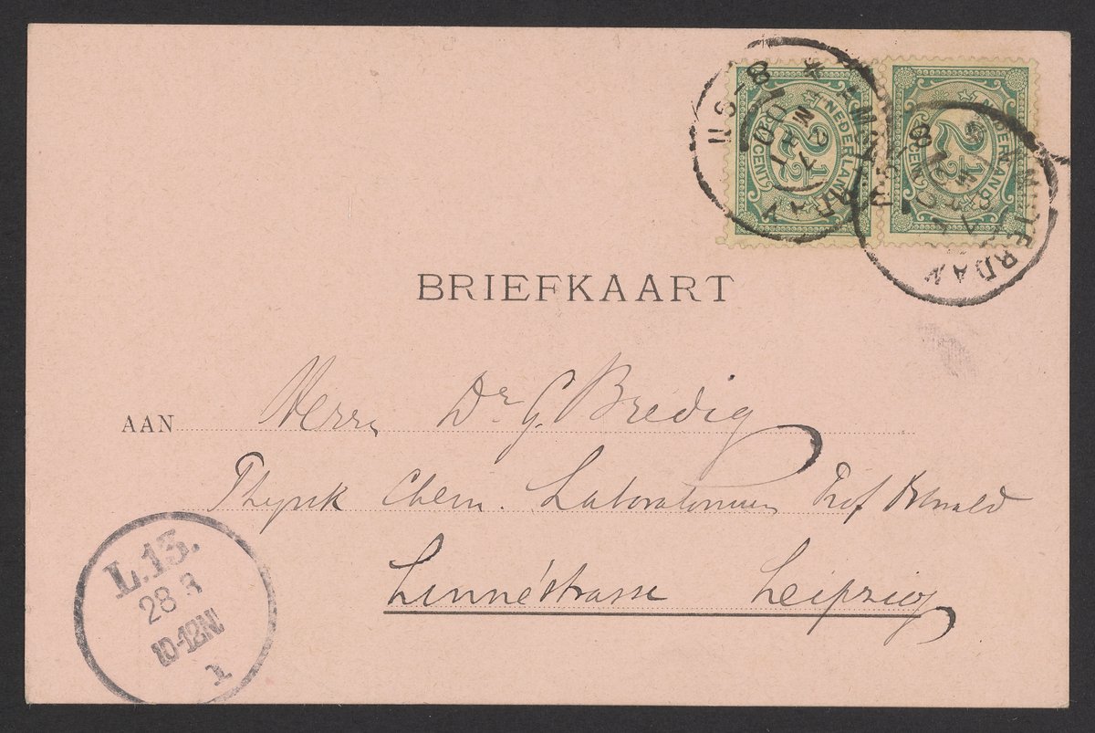 Bakhuis Roozeboom, Hendrik Willem. “Postcard from Hendrik Willem Bakhuis Roozeboom to Georg Bredig, March 1900,” March 28, 1900. Papers of Georg and Max Bredig, Box 2, Folder 43. Science History Institute. Philadelphia. https://digital.sciencehistory.org/works/batsg16.