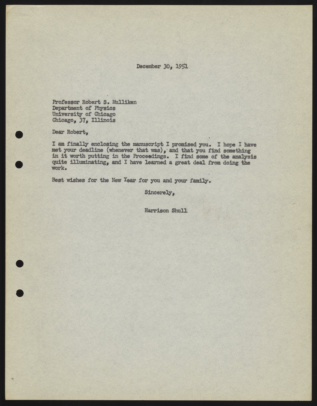 Letter from Harrison Shull to Robert S. Mulliken, 1951