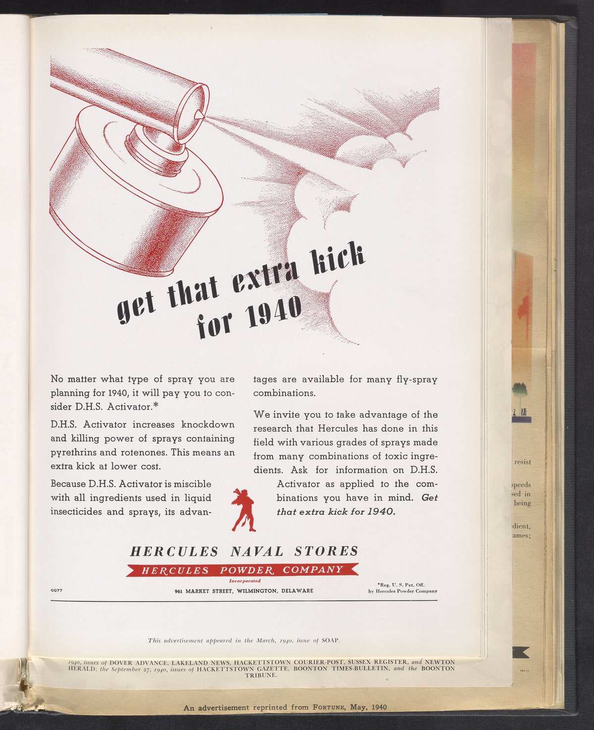Hercules Incorporated. “Get That Extra Kick for 1940.” 1940 Hercules Advertisements, 1940. Records of Hercules Incorporated, Volume 1940. Science History Institute. Philadelphia. https://digital.sciencehistory.org/works/bc386k05f.