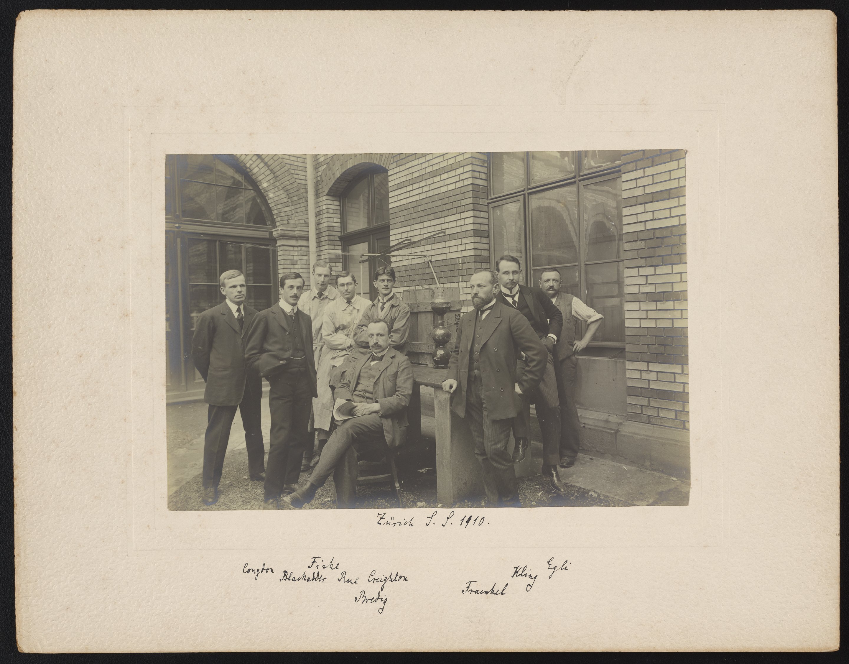 Small JPG1200 x 938px — 160 KBLarge JPG2880 x 2252px — 847 KBFull-sized JPG6627 x 5182px — 4.2 MBOriginal fileTIFF — 6627 x 5182px — 98.3 MBBlack and white photograph of Georg Bredig (1868-1944) and fellow chemists at the Technische Hochschule, in Zürich, Switzerland. Bredig is seated and his colleagues are posed around him. Bredig has annotated the names of those pictured beneath the photograph. He has identified, from left to right, Edgar Davidson Congdon (1879-1970), Thomas Blackadder (1887-1953), Paul S. Fiske, "Rue", H. Jermain Creighton (1886-), Walter Fraenkel (1879-1945), "Kling", and "J. Egli."