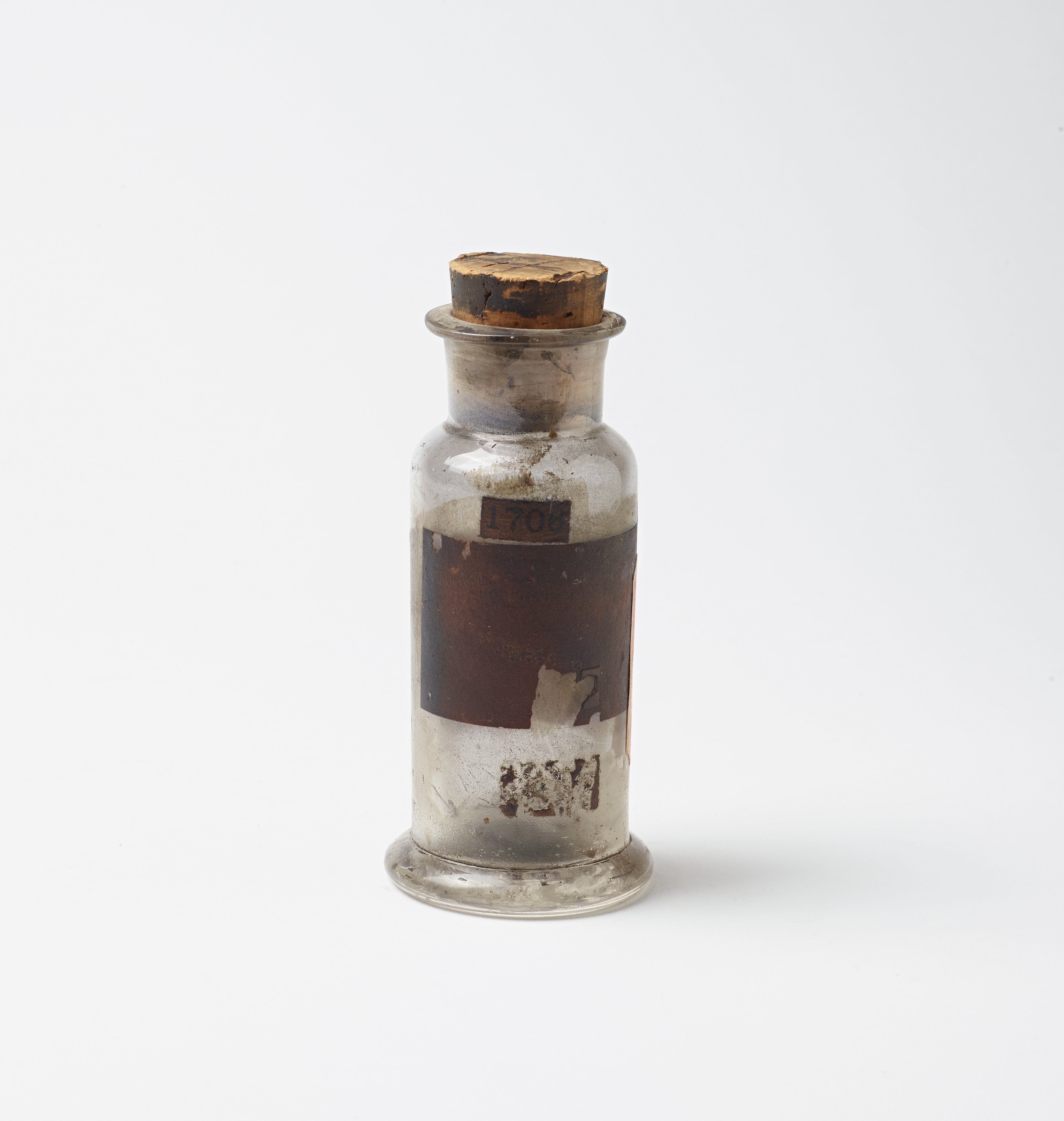 Round glass bottle with cork stopper; label attached to front identifies manufacturer and contents (label has been waxed over).