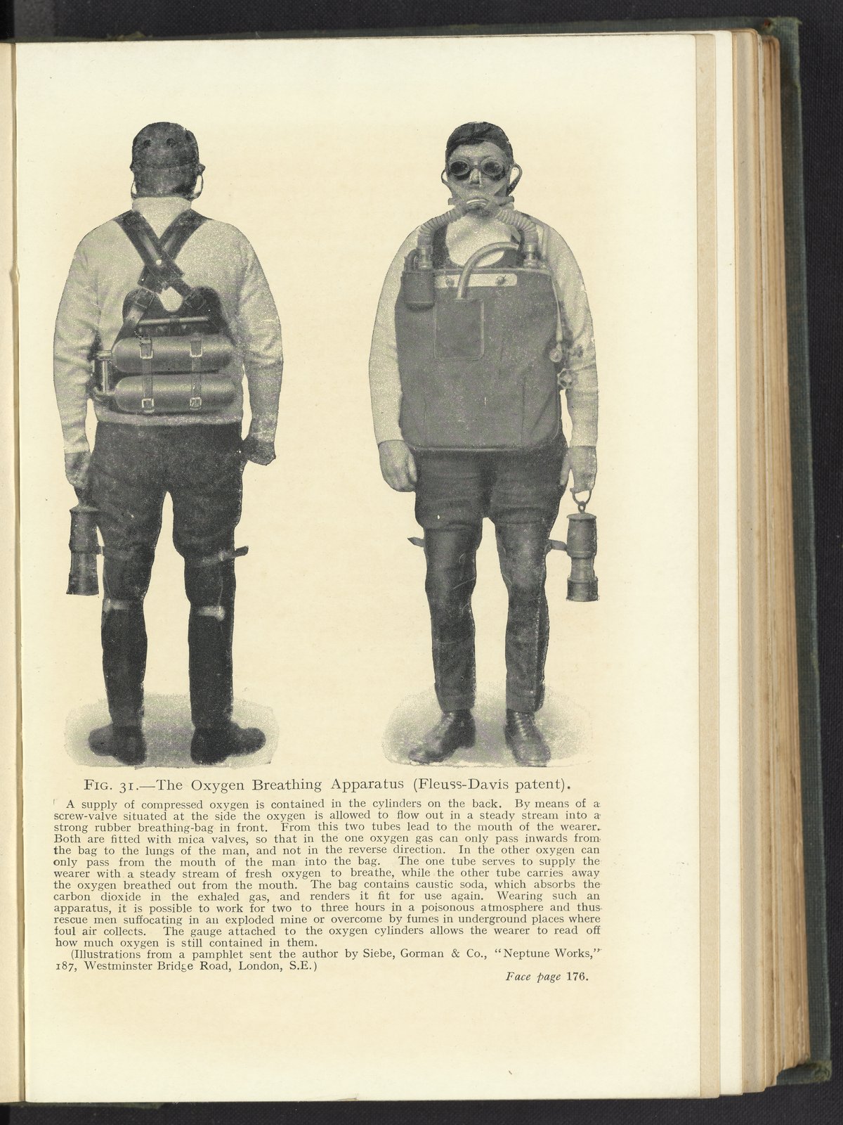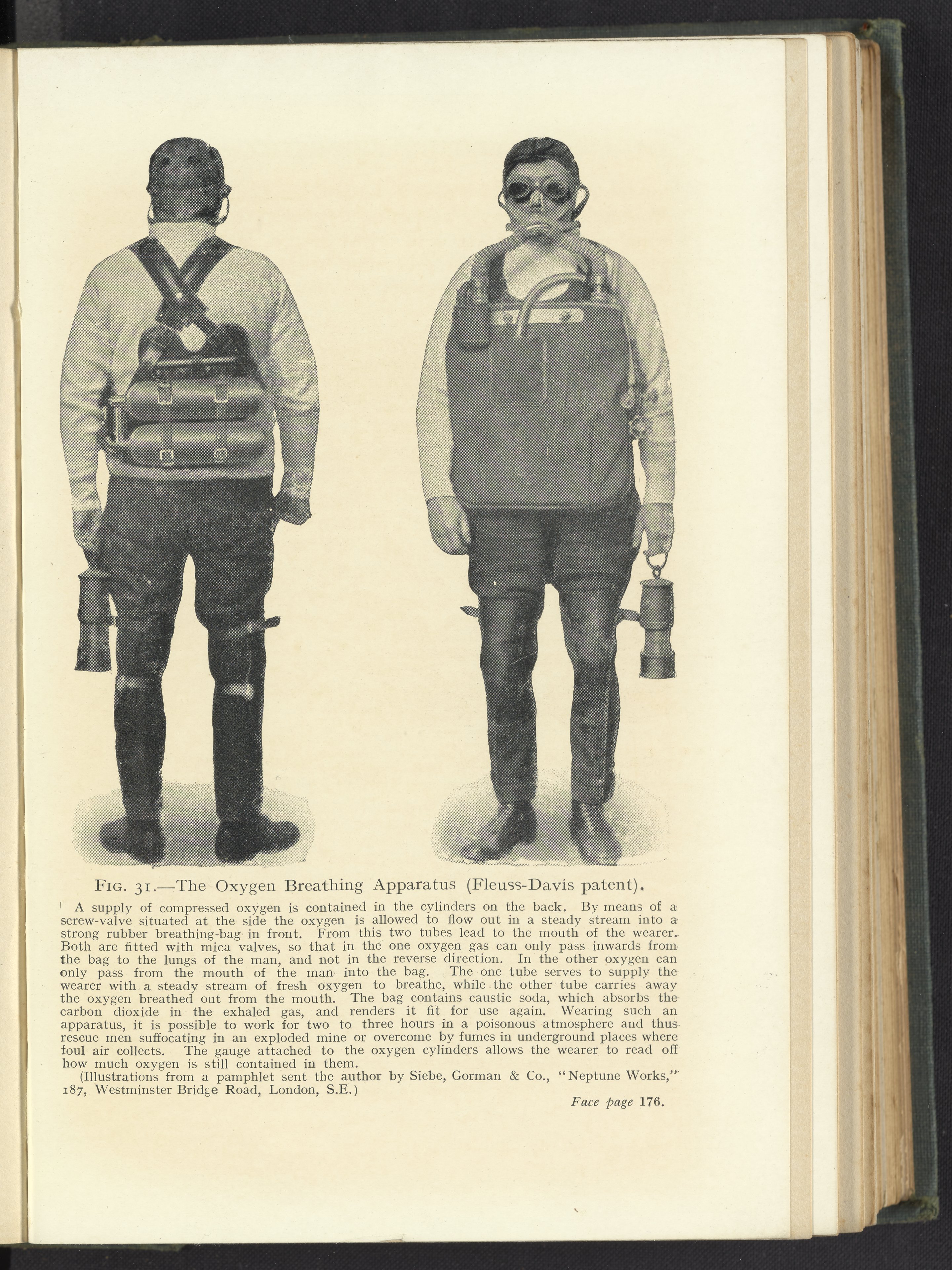 Martin, Geoffrey. “Fig. 31: The Oxygen-Breathing Apparatus (Fleuss-Davis Patent).” Triumphs & Wonders of Modern Chemistry. New York, New York: D. Van Nostrand Company, 1913. https://digital.sciencehistory.org/works/bg257f577.