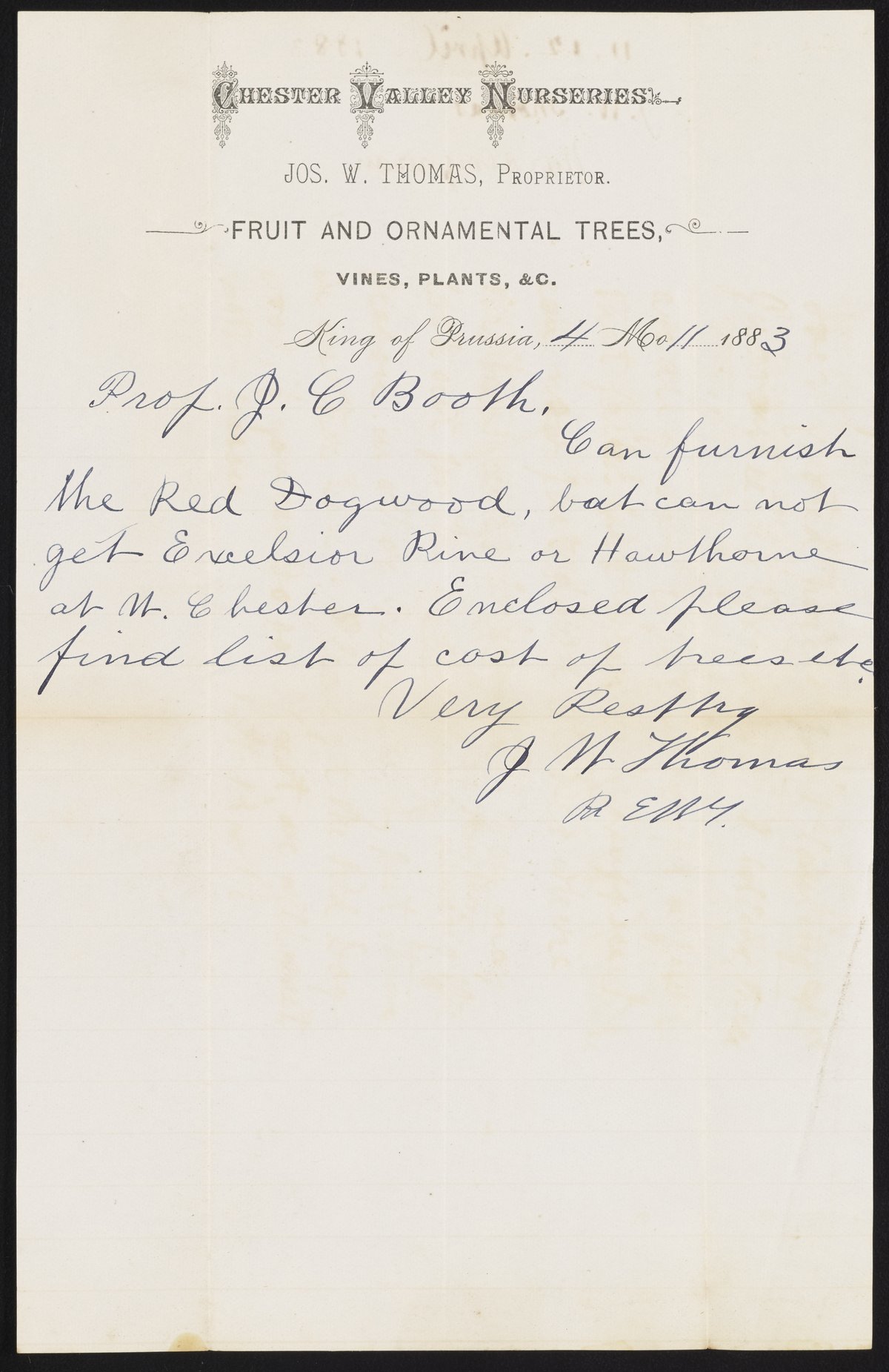Thomas, Joseph W. “Letter from J.W. Thomas to James Curtis Booth, April 11, 1883,” April 11, 1883. Papers of James Curtis Booth, Box 2, Folder 10. Science History Institute. Philadelphia. https://digital.sciencehistory.org/works/bhgiho5.