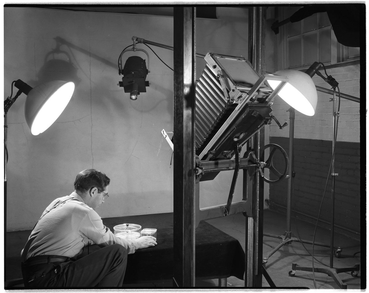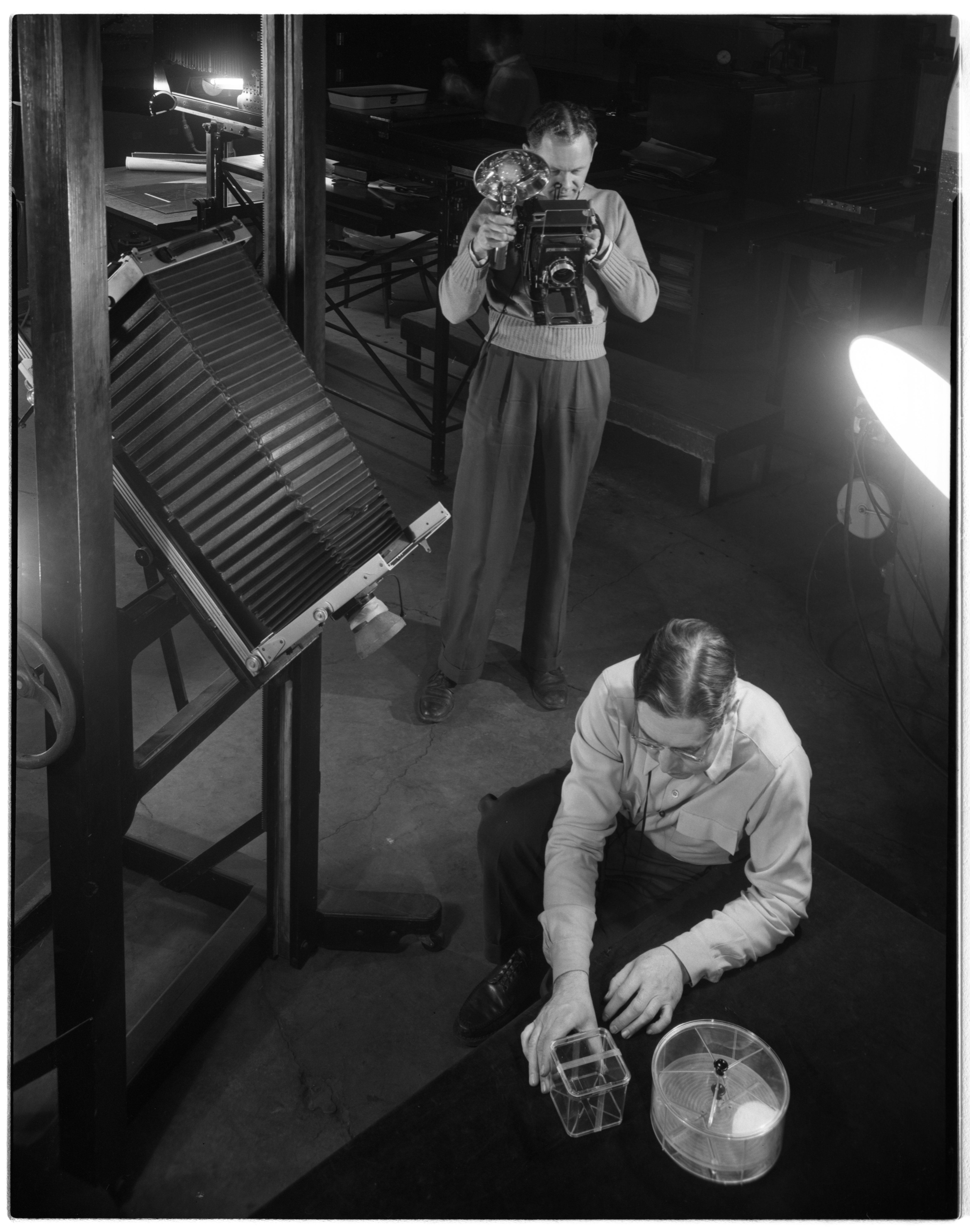 Small JPG1200 x 1525px — 218 KBLarge JPG2880 x 3659px — 875 KBFull-sized JPG4571 x 5808px — 1.7 MBOriginal fileTIFF — 4571 x 5808px — 25.3 MBTwo views of senior photo technician Joe Jardis (standing) and Photo Lab director Bill Shetzley arranging Styron refrigerator receptacles during a photo shoot in the Dow Chemical Company's Photographic Laboratory. Established in the 1930's, the Photo Lab took pictures for employee publications like The Brine Well and Dow Diamond, as well as for newspaper and magazine releases sent out by Dow's Editorial Service and Advertising Department.