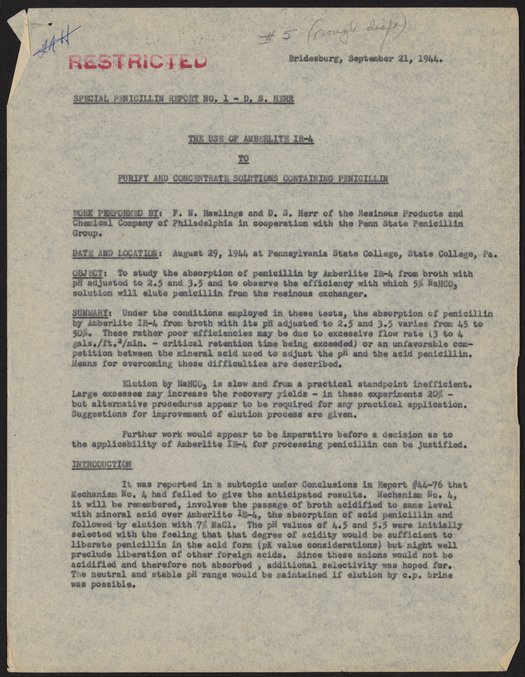 A report conducted by F. N. Rawlings and written by Donald S. Herr (1915-2003) on the use of Amberlite IR-4 to purify and concentrate solutions containing penicillin. The report was conducted by the Resinous Products and Chemical Company of Philadelphia, later to become the Rohm and Haas Company, in collaboration with the War Production Board's Penicillin group, and was performed at Pennsylvania State University.