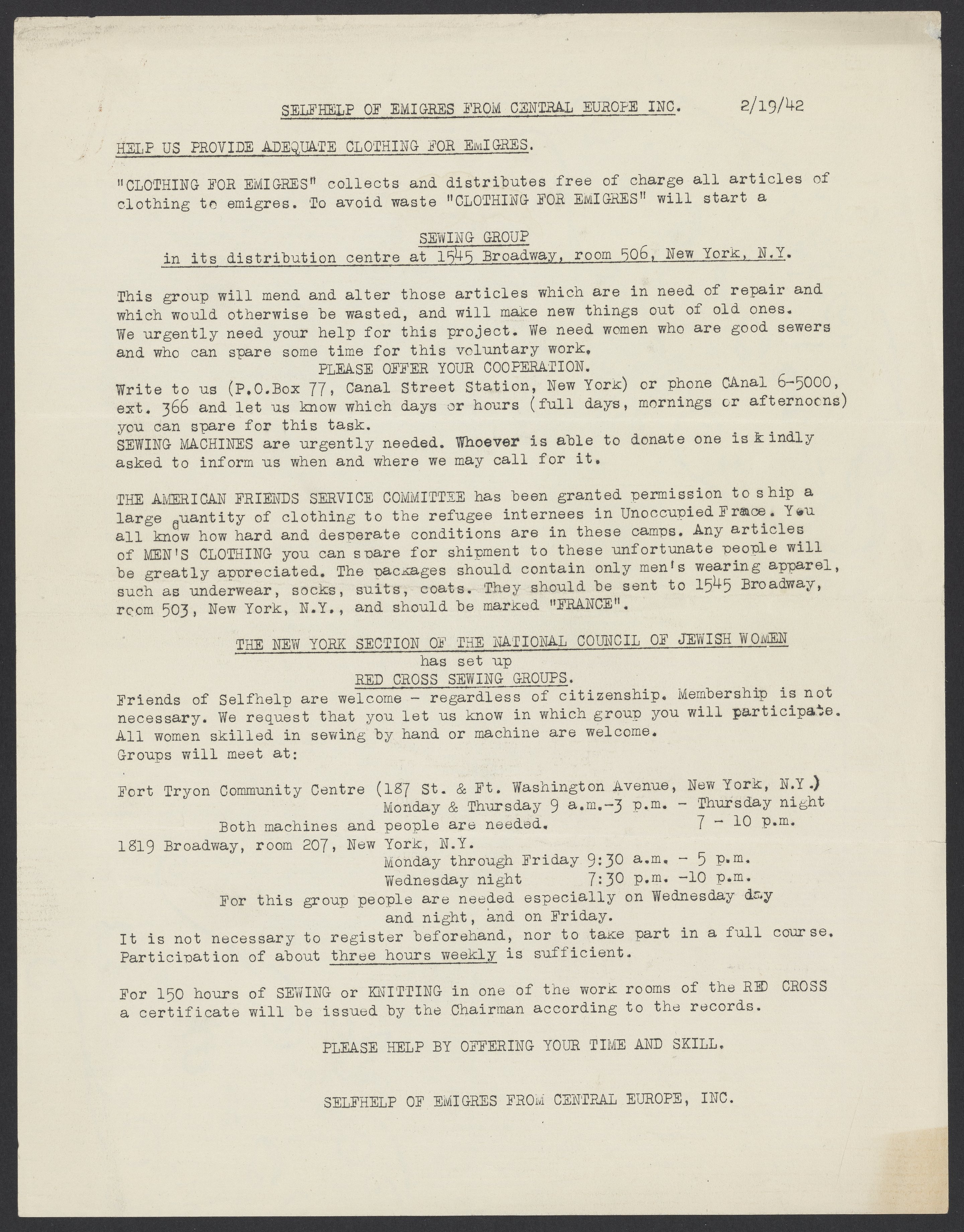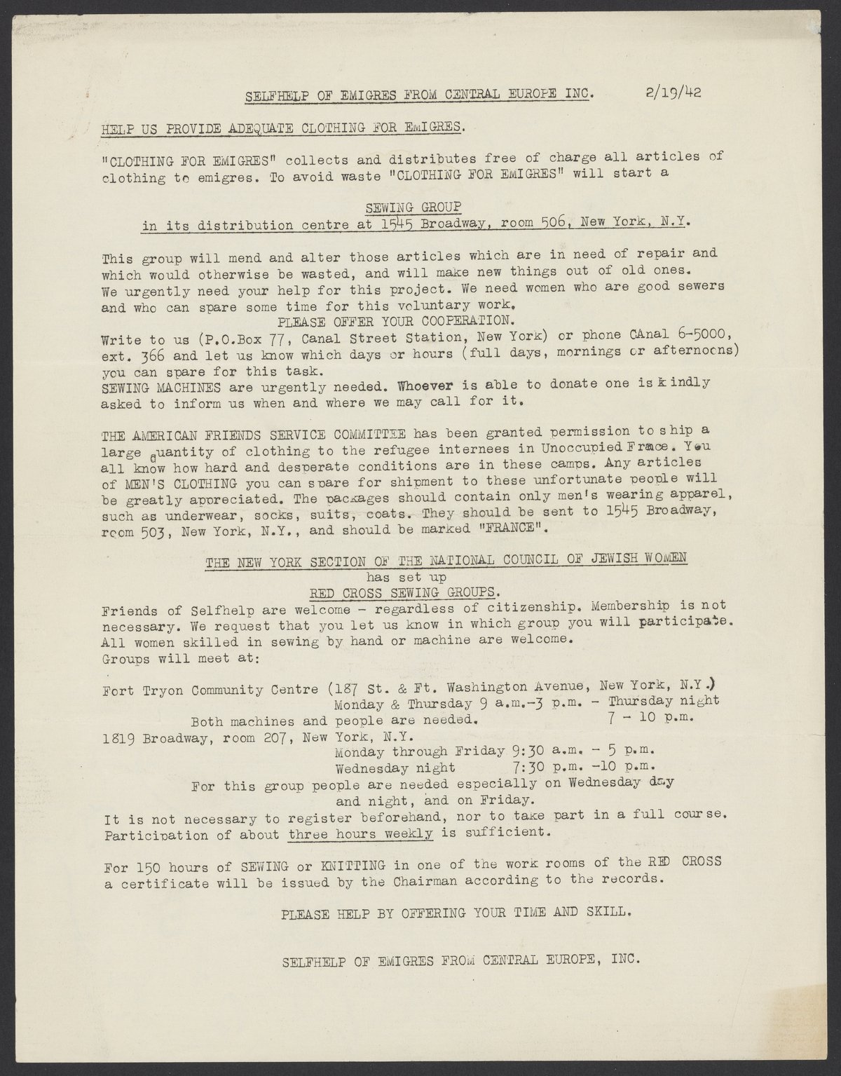 Letter from Selfhelp of Emigres from Central Europe, February 19, 1942