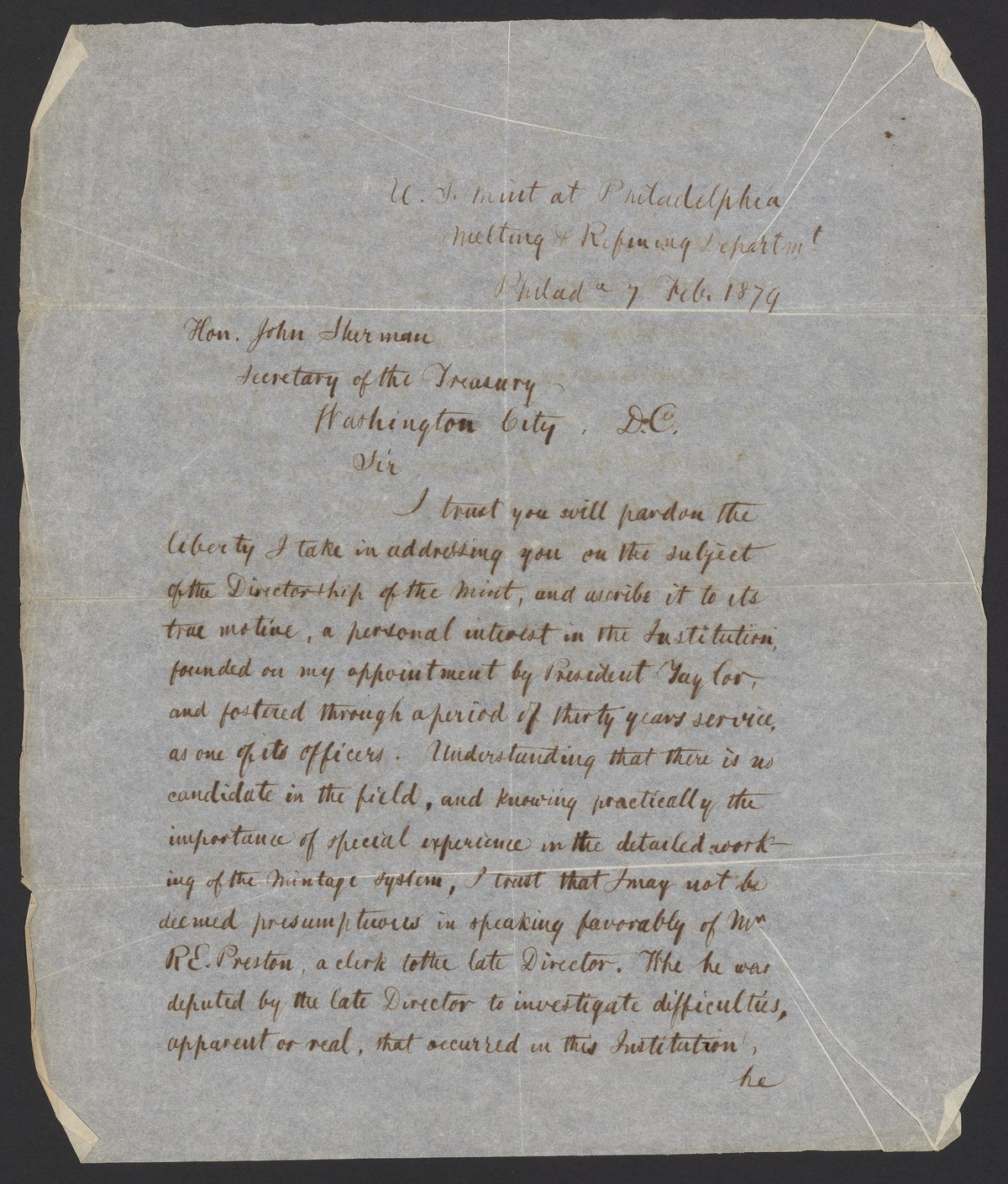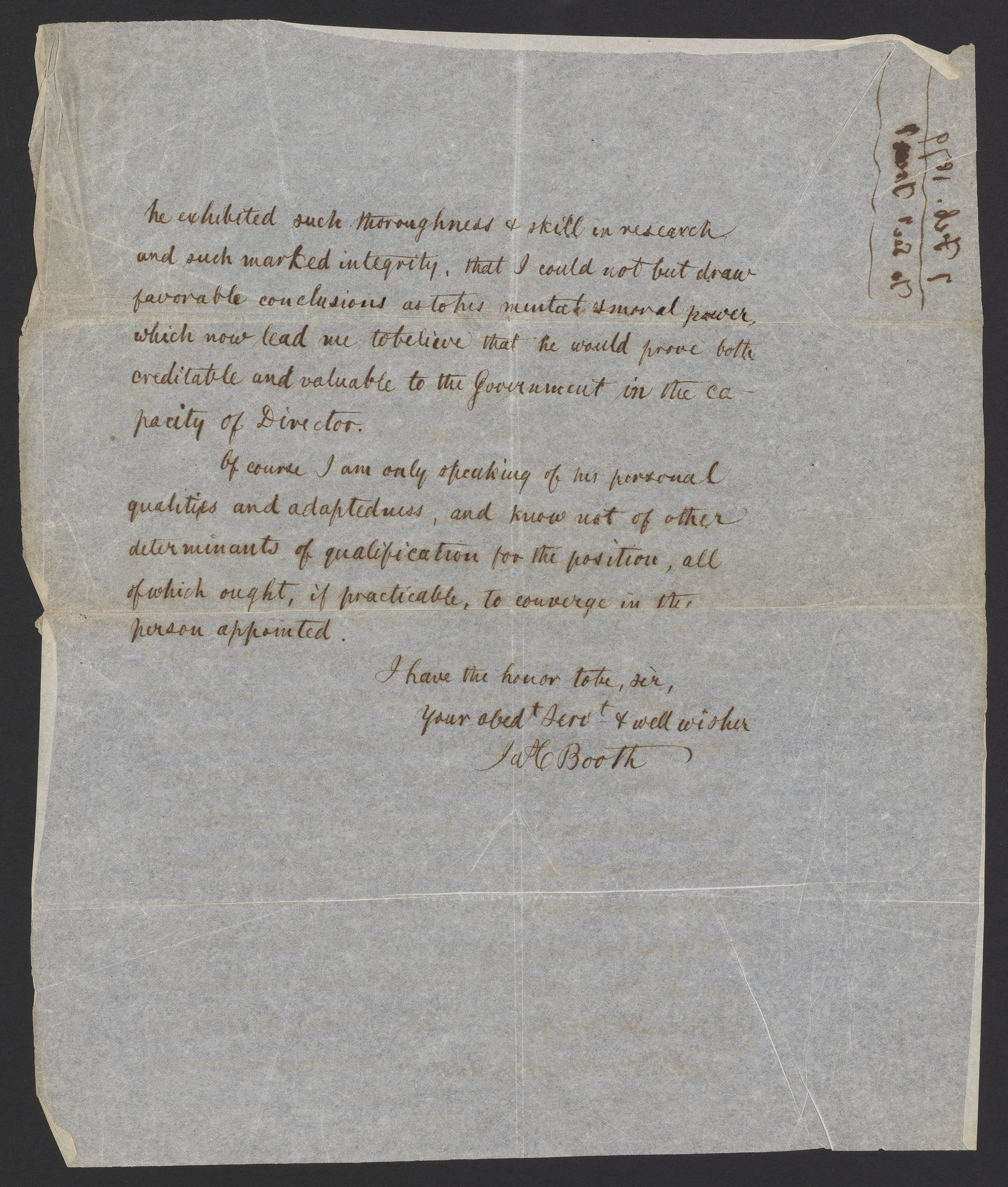 Letter from James Curtis Booth to John Sherman
