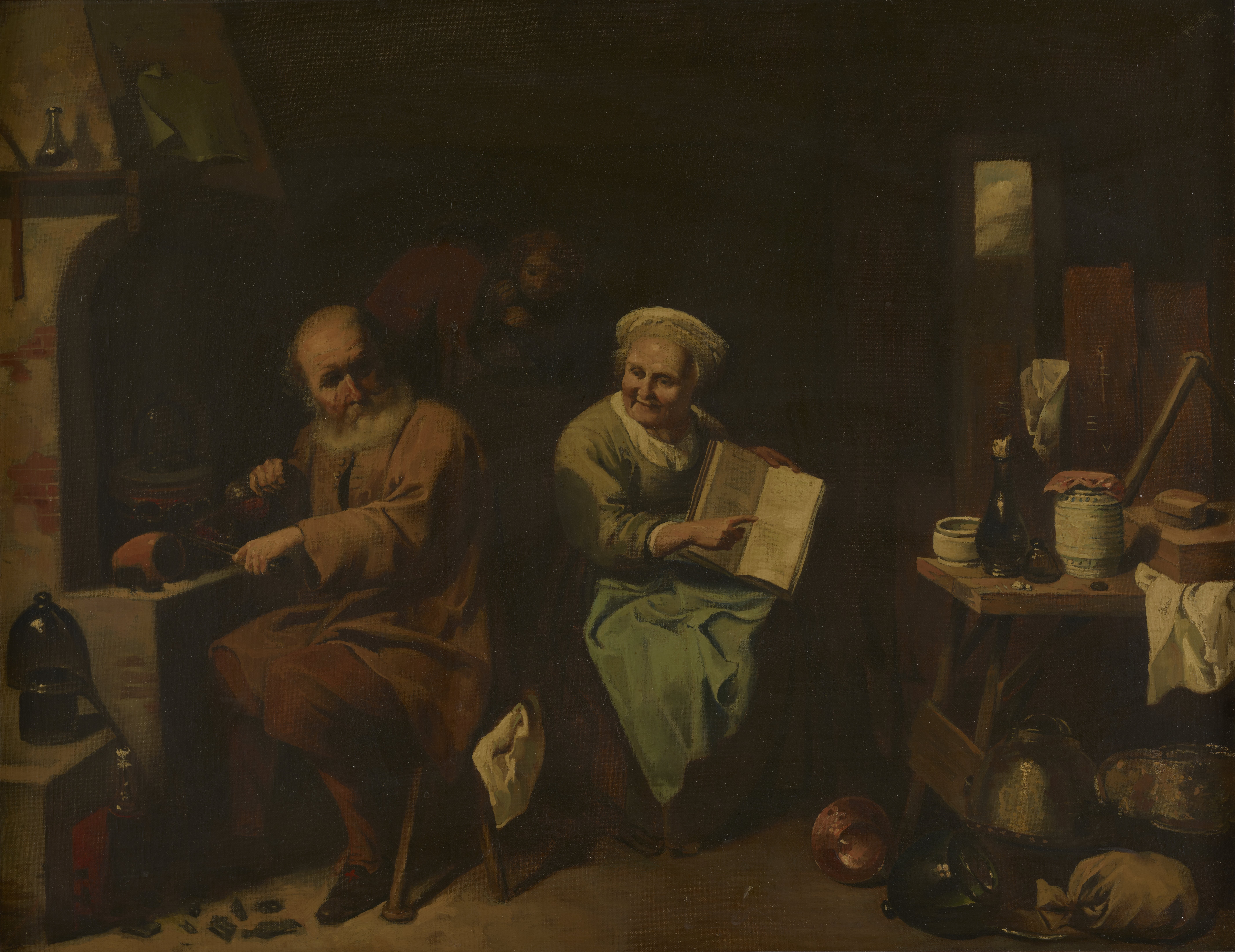 When Chester Fisher commissioned this copy of a painting by David Ryckaert III (1612-1661), in the Royal Museums of Fine Arts of Belgium, Brussels, it was long assumed that the painting depicted the famous Nicolas Flamel (circa 1340–1418) and his wife Perrenelle, pursuing an alchemical experiment. The Flamels gained a posthumous reputation as alchemists, but their connection with alchemy is now debated. Newer thinking about David Ryckaert III's composition proposes that it is far likelier a genre scene of an anonymous husband-and-wife team practicing alchemy in a domestic setting.