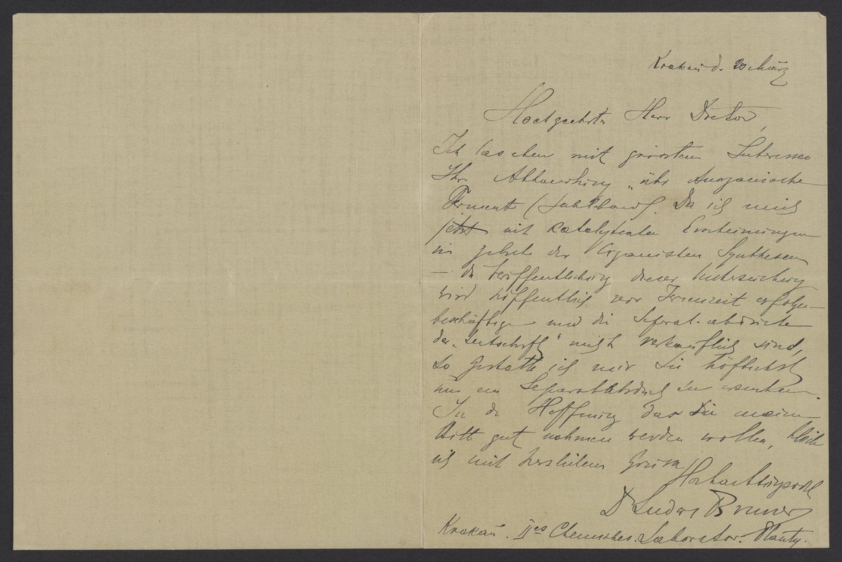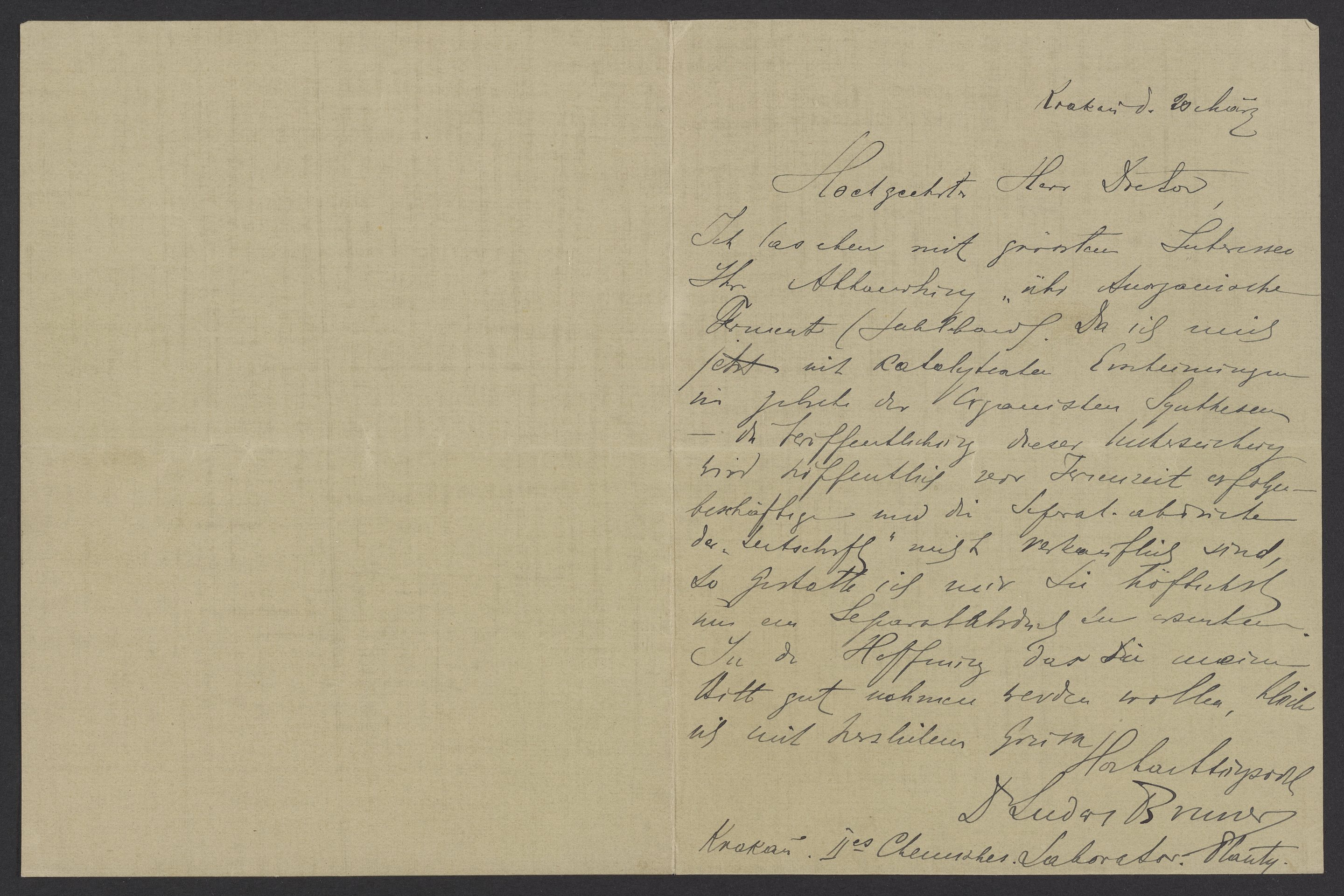 Ludwik Bruner (1843-1910), a physical chemist and a professor of chemistry at the Jagiellonian University in Cracow, Poland, thanks Georg Bredig (1868-1944) for sending his habilitation thesis "Anorganische Fermente" (Inorganic Ferments). In many Germanophone countries, a habilitation is a post-doctoral degree intended to demonstrate a scholar's capacity for research in his or her field and is usually required to attain the rank of professor.